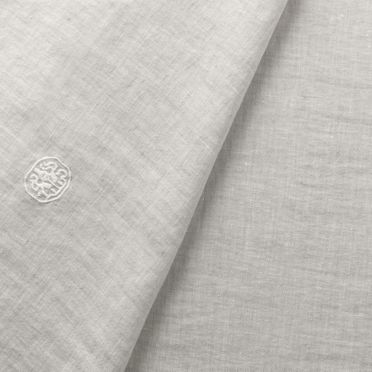 Das Material Leinen ist weich, schwer und natürlich luxuriös. Einer der Vorteile von Plain ist der elegante Look, auch wenn die Tischdecke nicht frisch gebügelt ist. Dies macht Variationen und das Spiel mit dem Stil am gedeckten Tisch leicht. Leinenservietten in Grau oder Weiß mit gesticktem Logo vervollständigen den Look.