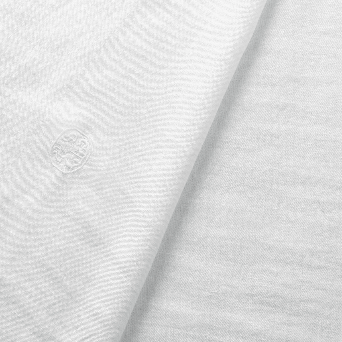 Als Material ist Leinen weich und schwer – und besonders luxuriös. Die Tischdecke sieht auch dann schön aus, wenn sie nicht frisch gebügelt ist. Auf diese Weise bietet sie ideale Möglichkeiten, um zu variieren und mit dem Look des Tischgedecks zu spielen. Leinenservietten in Grau oder Weiß mit gesticktem Logo komplettieren den Look.