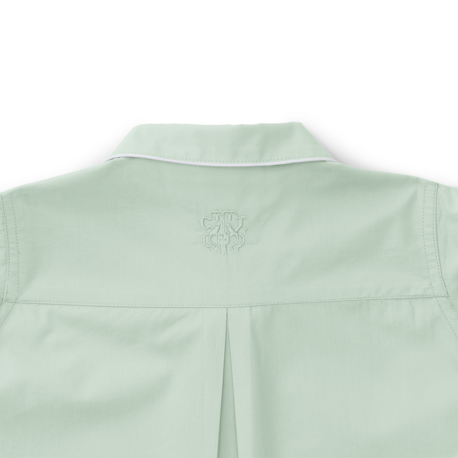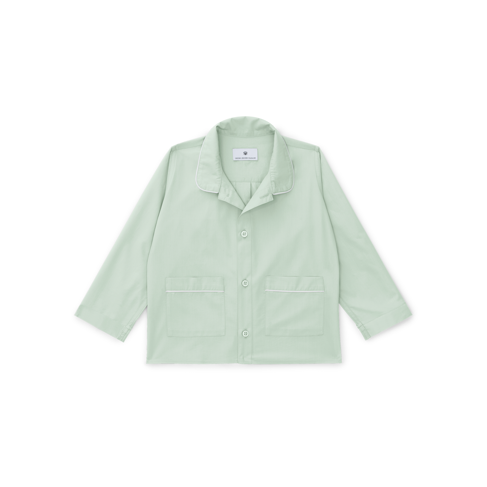 Das Oberteil hat Seitenschlitze, eine Brusttasche, einen abgerundeten Kragen und das ikonische Georg Jensen Damask-Logo ist auf die Rückenpasse gestickt. Die Hose hat einen breiten und bequemen Gummibund sowie Taschen. Hosen- und Ärmellänge lassen sich durch Umschlagen leicht anpassen, wobei die Innenseite eine elegante Paspelierung zeigt.