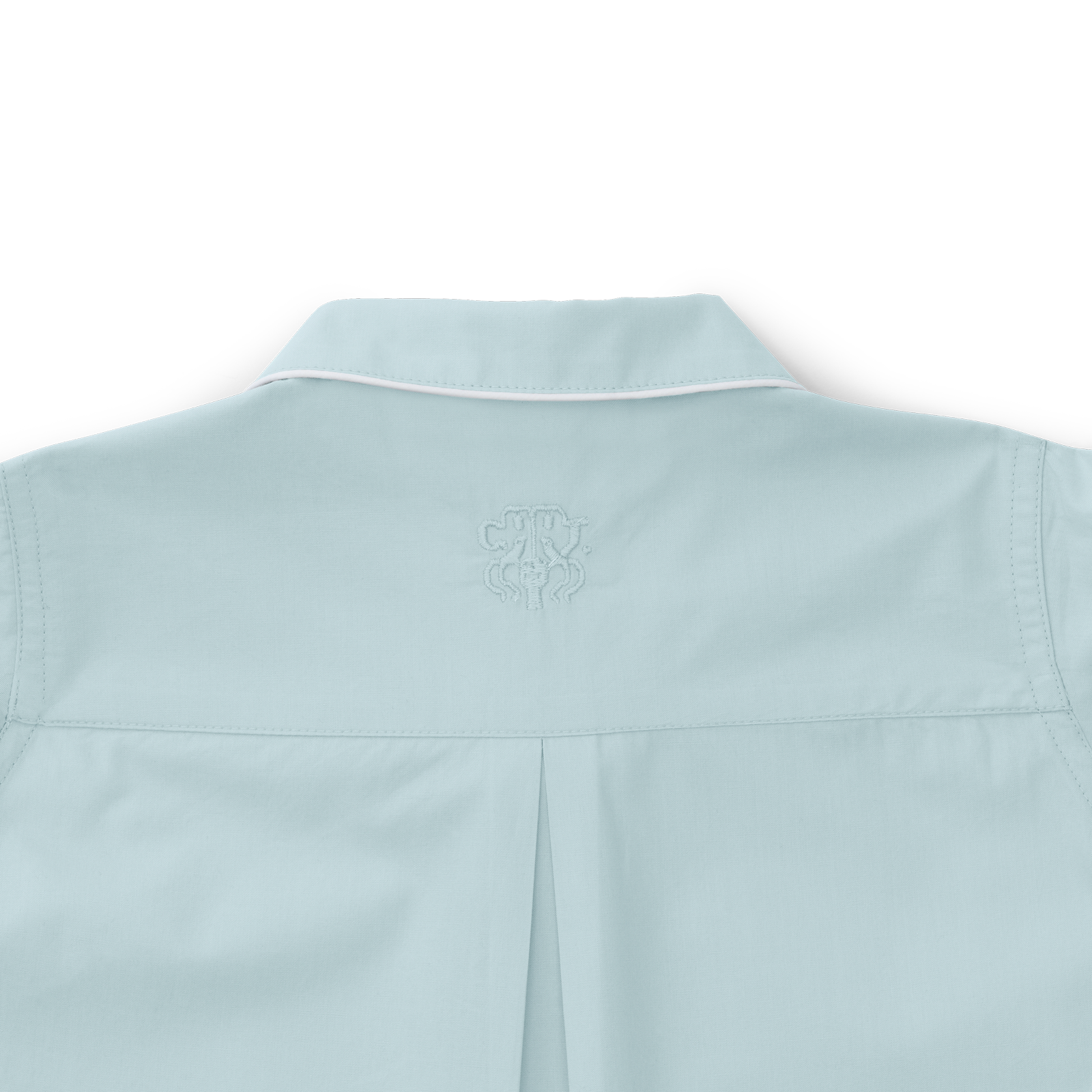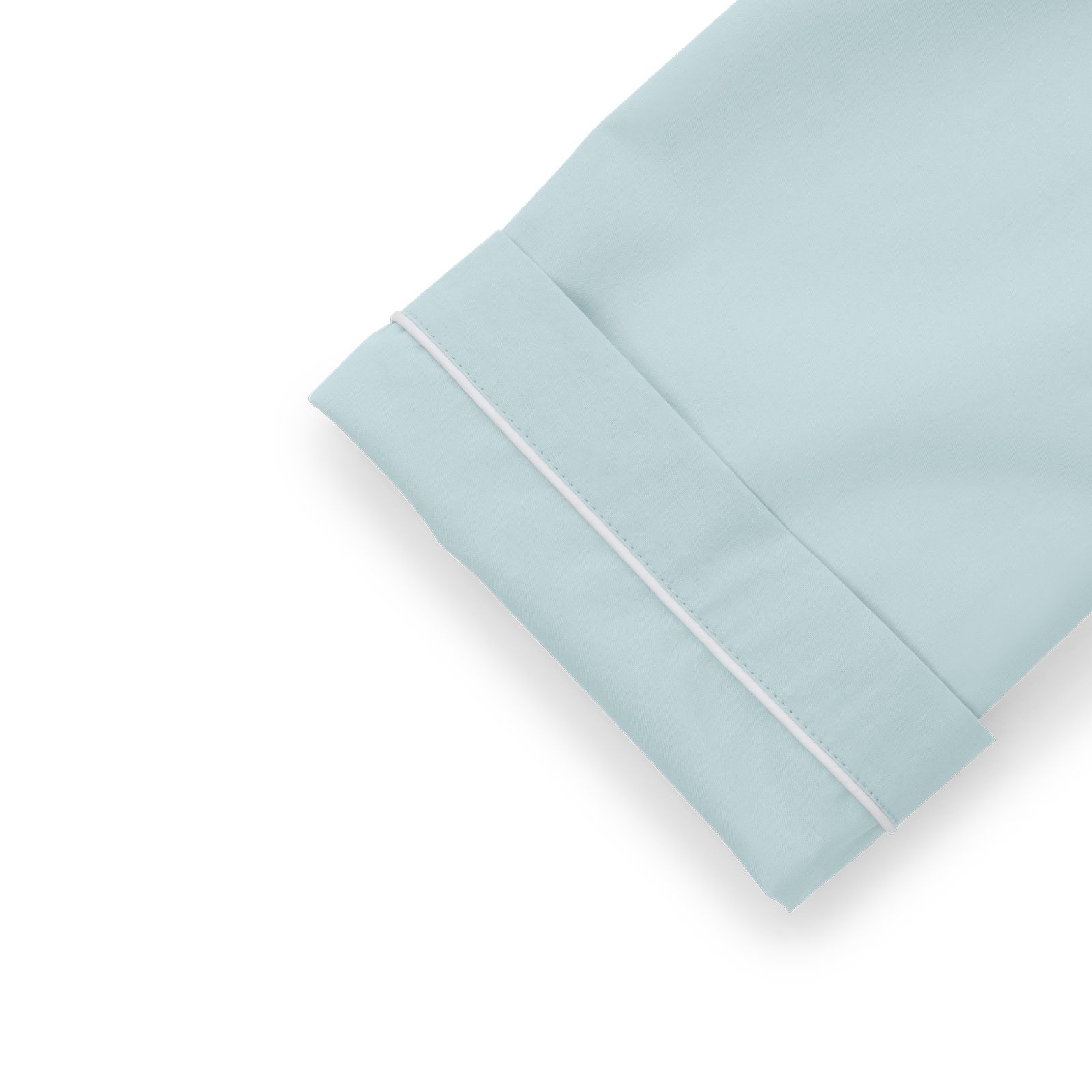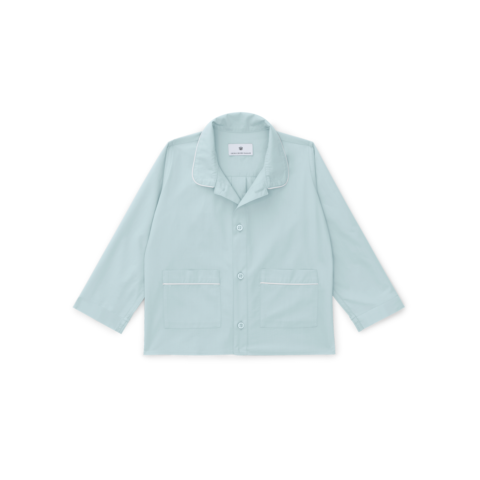 Unisex-Kinderpyjama aus perkalgewebter Supima-Baumwolle. Minimal Blue ist ein sehr heller Blauton mit einem Hauch von Aquanuancen.