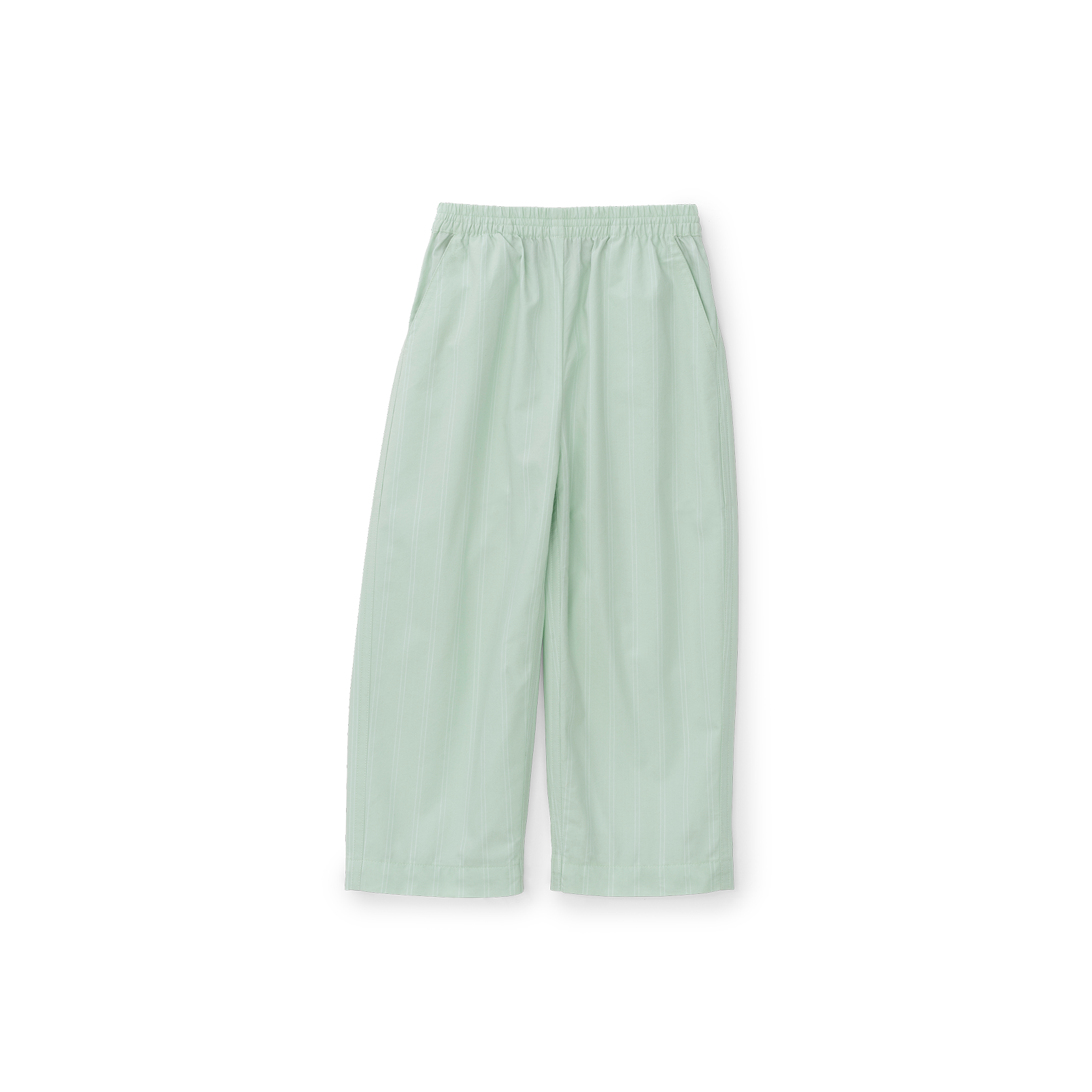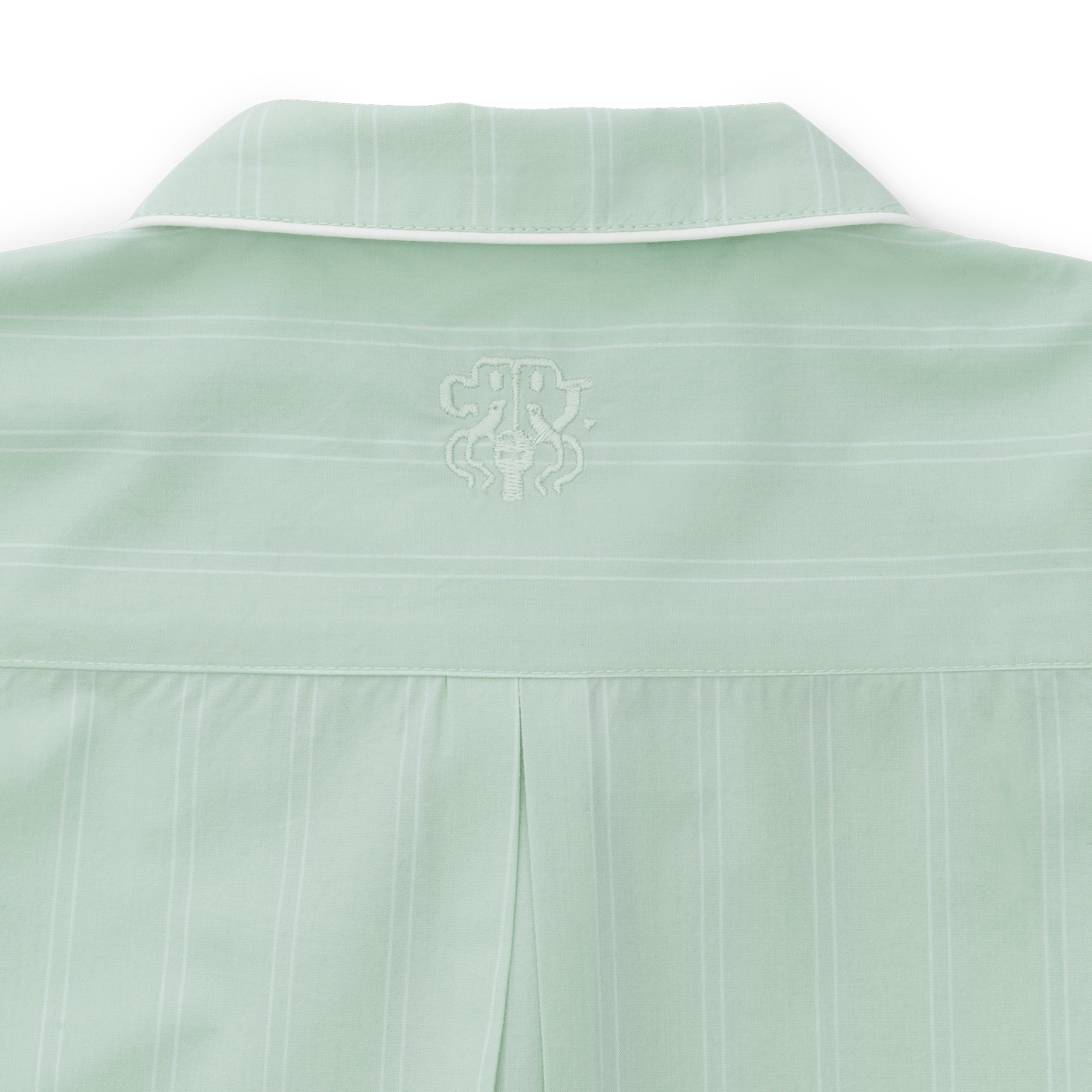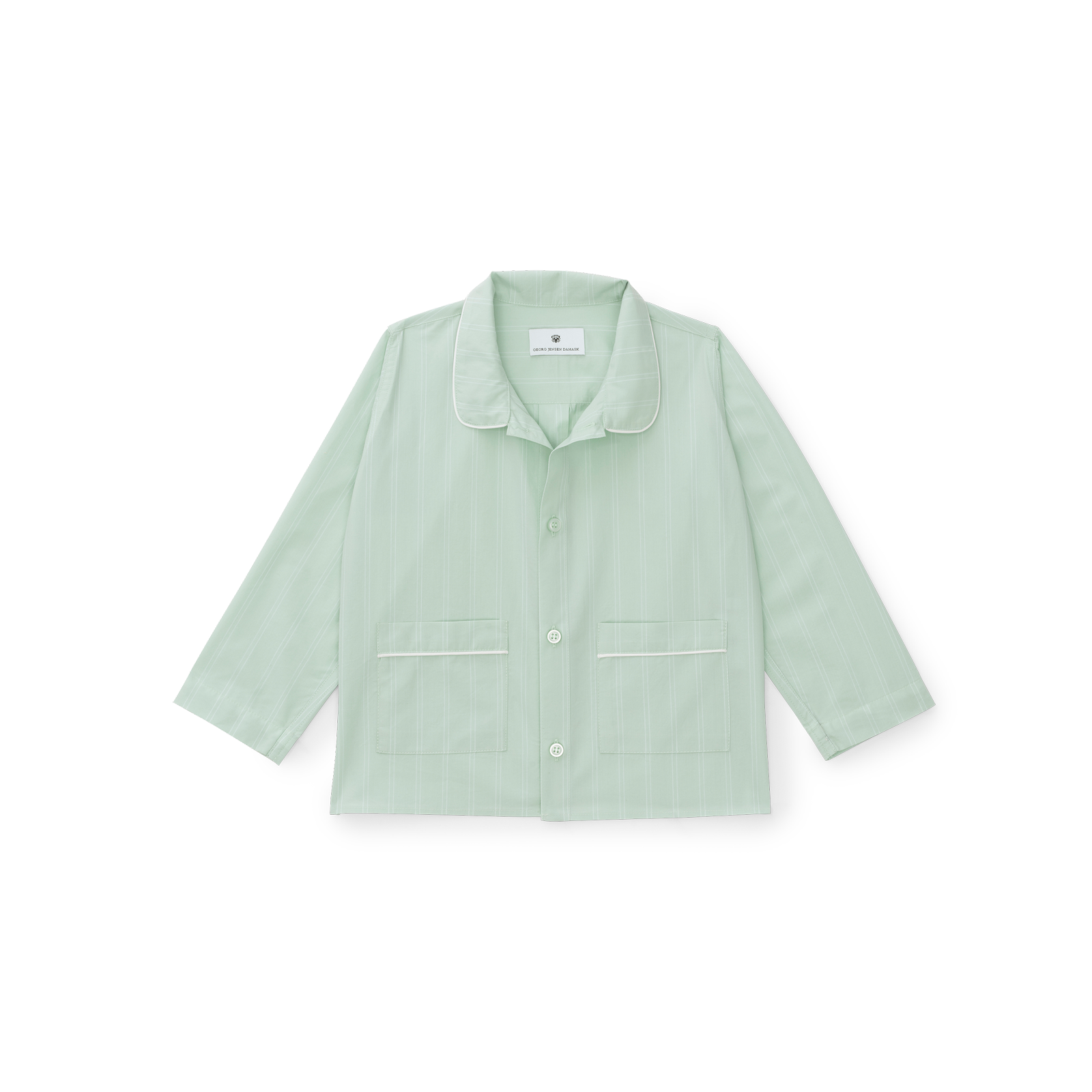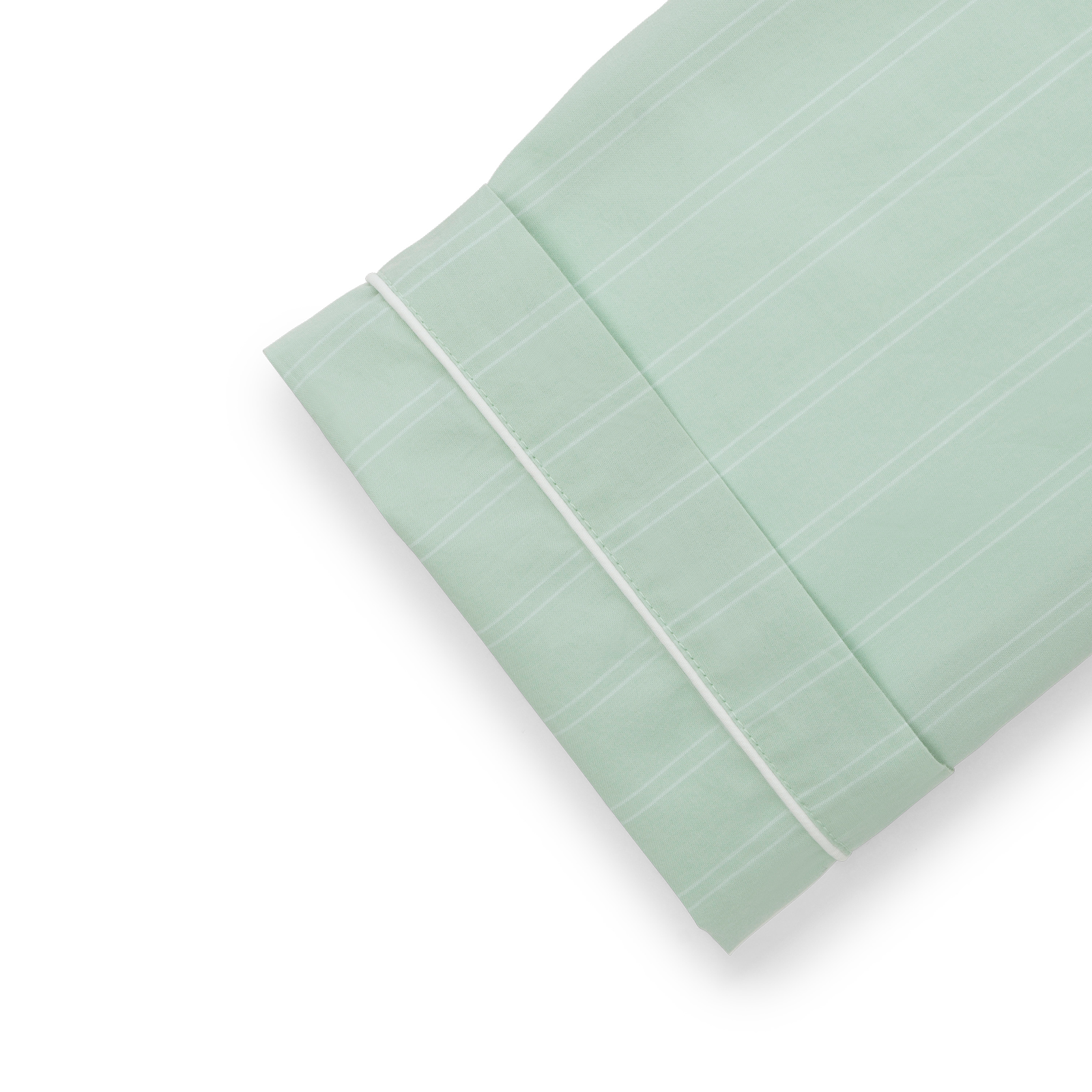 Unisex-Pyjama für Kinder aus Supima-Baumwollperkal gewebt. Der Pyjama hat einen klassischen Schnitt, elegante weiße Paspeln und schlanke Nadelstreifen vor einem Hintergrund in der Farbe Glass Green – ein klarer, grünlich-blauer Farbton, der von der Farbe von Rohglas inspiriert ist.