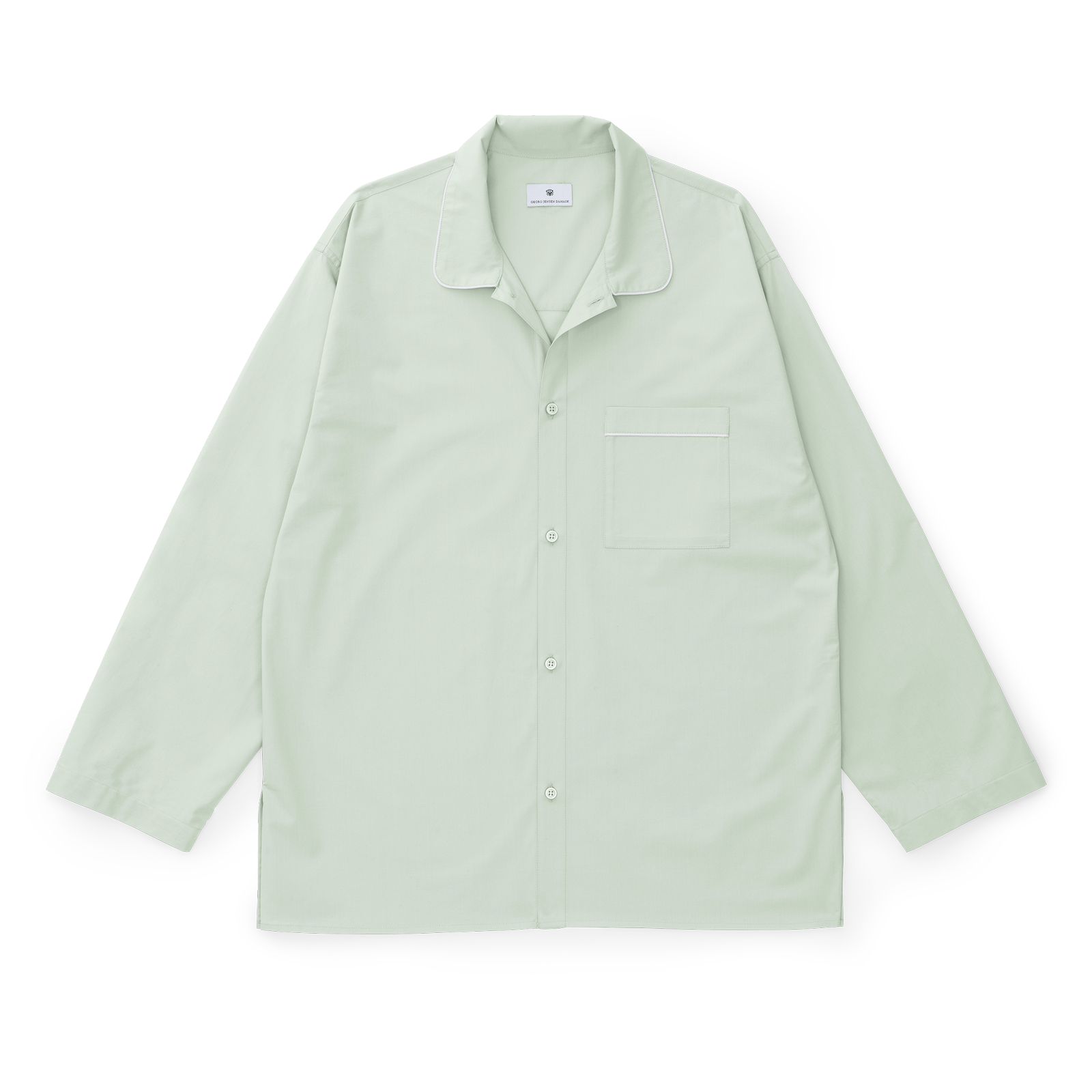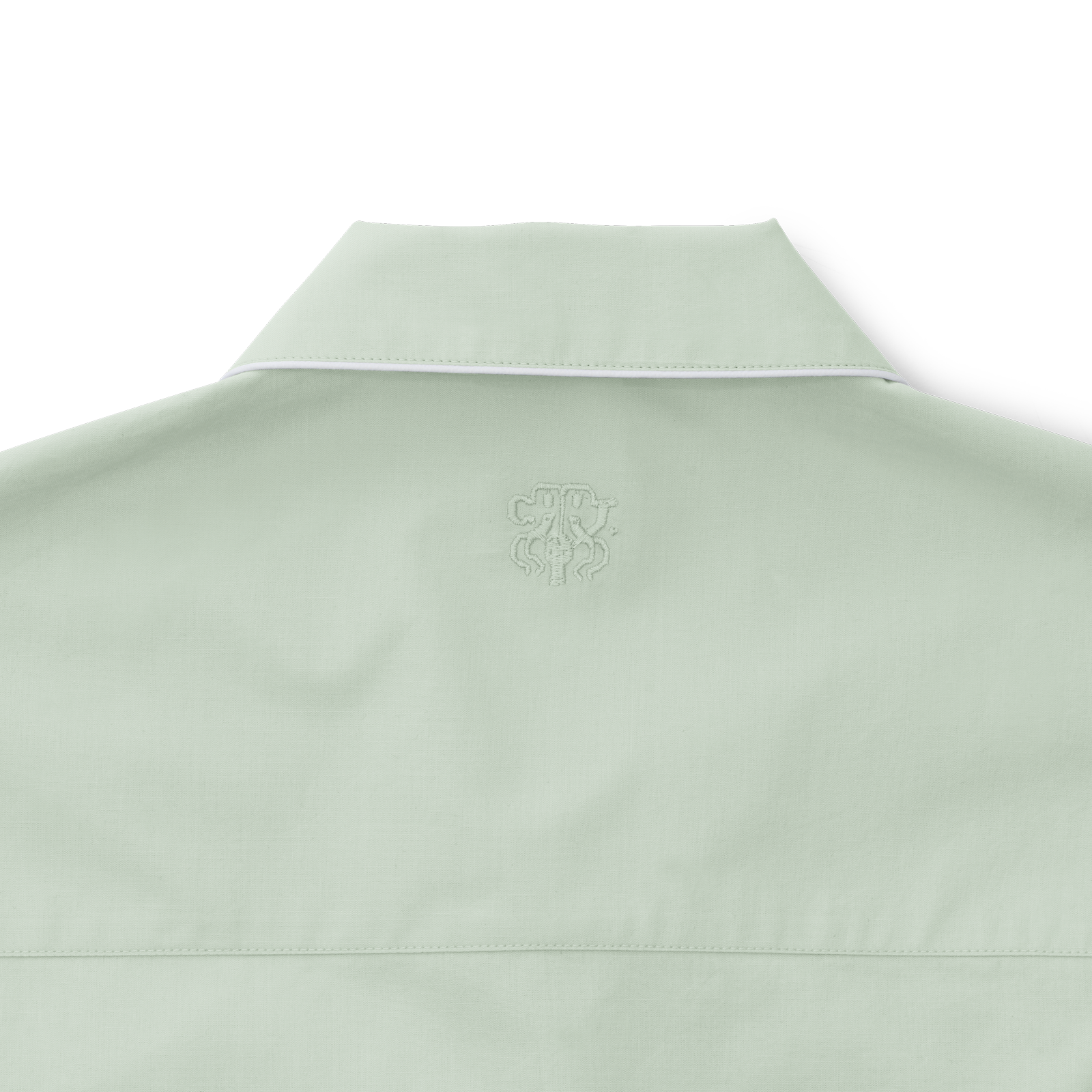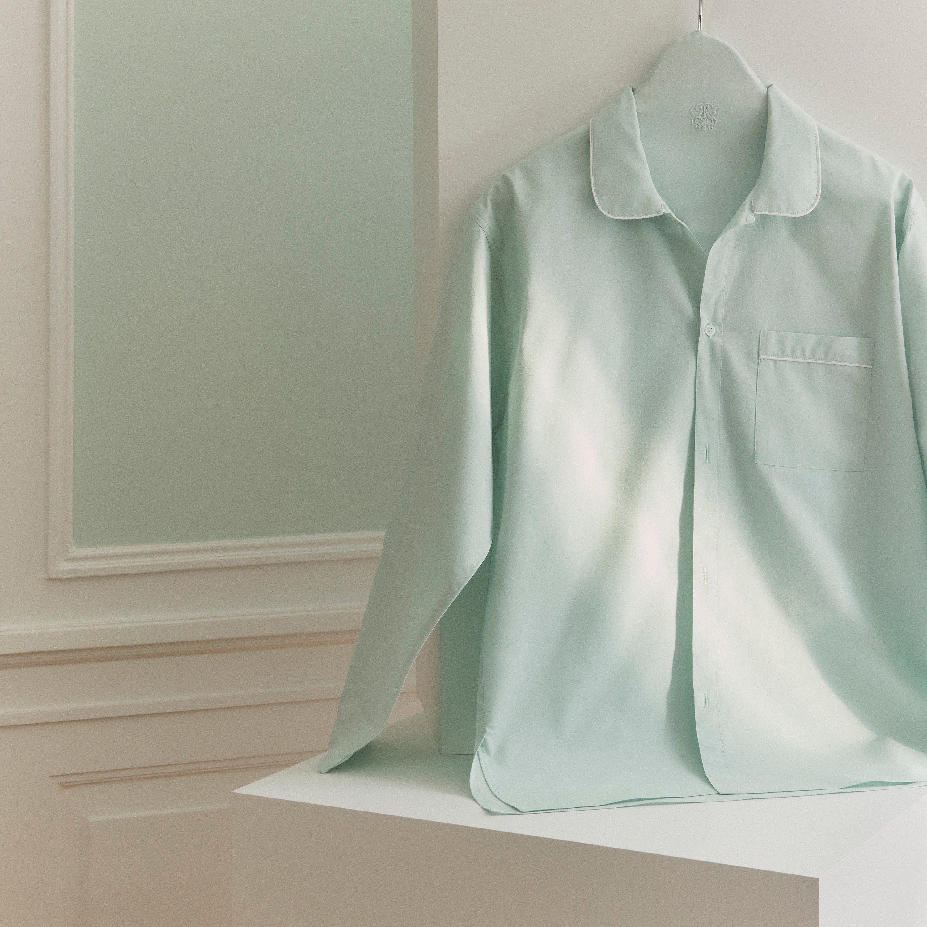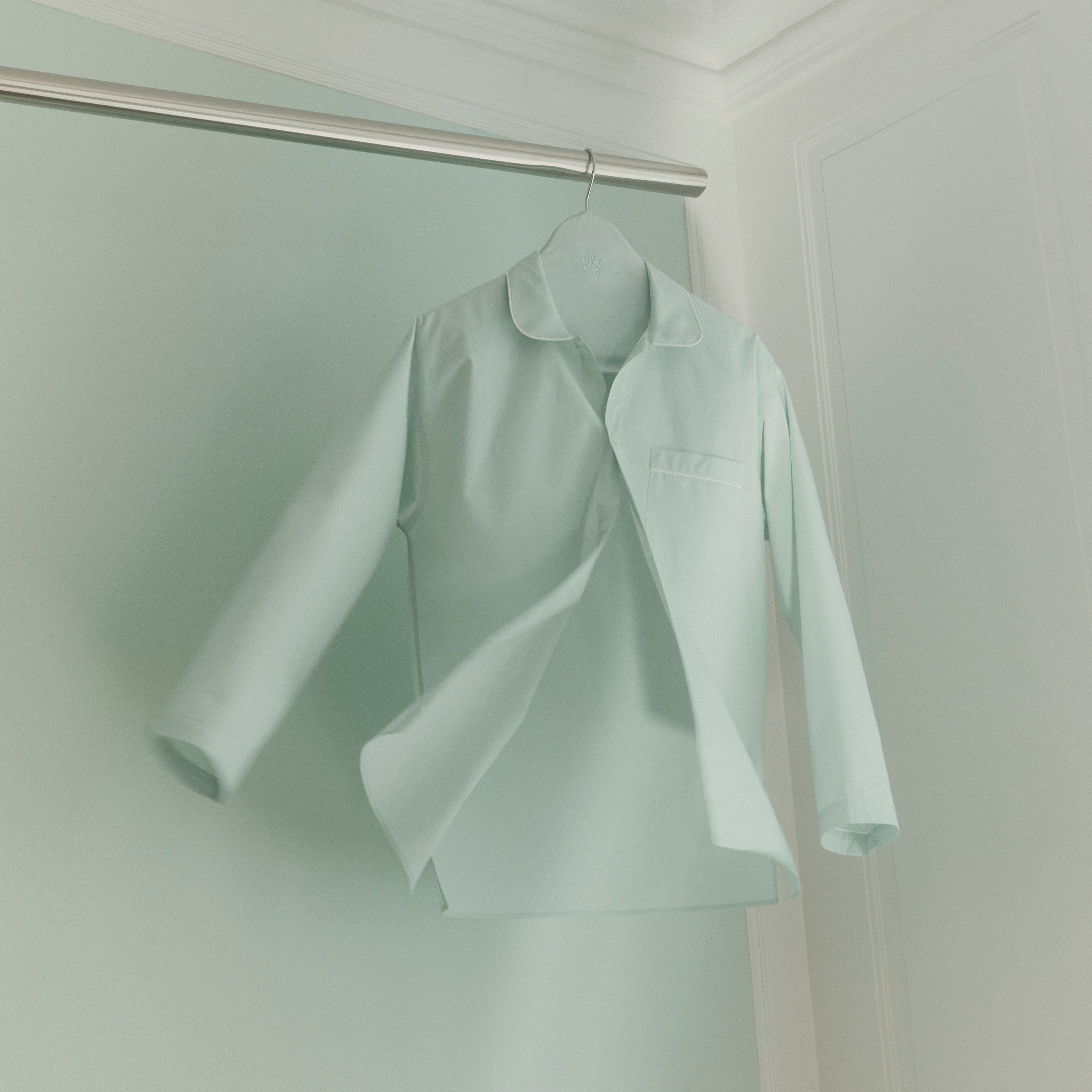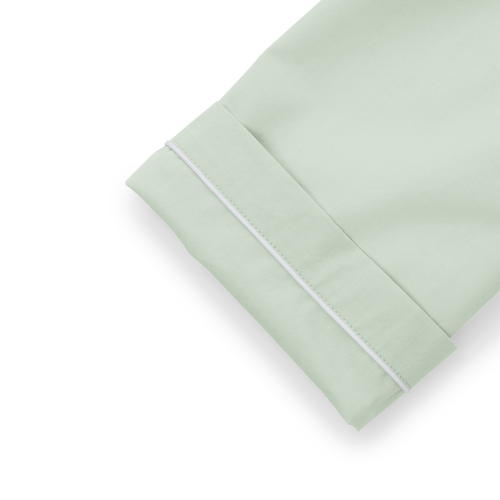 Unisex-Pyjama aus percalegewebter Supima-Baumwolle. Der Pyjama hat einen klassischen Schnitt und elegante weiße Paspeln. Die klare grün-blaue Farbe Glass Green ist inspiriert von der Farbe von Rohglas.