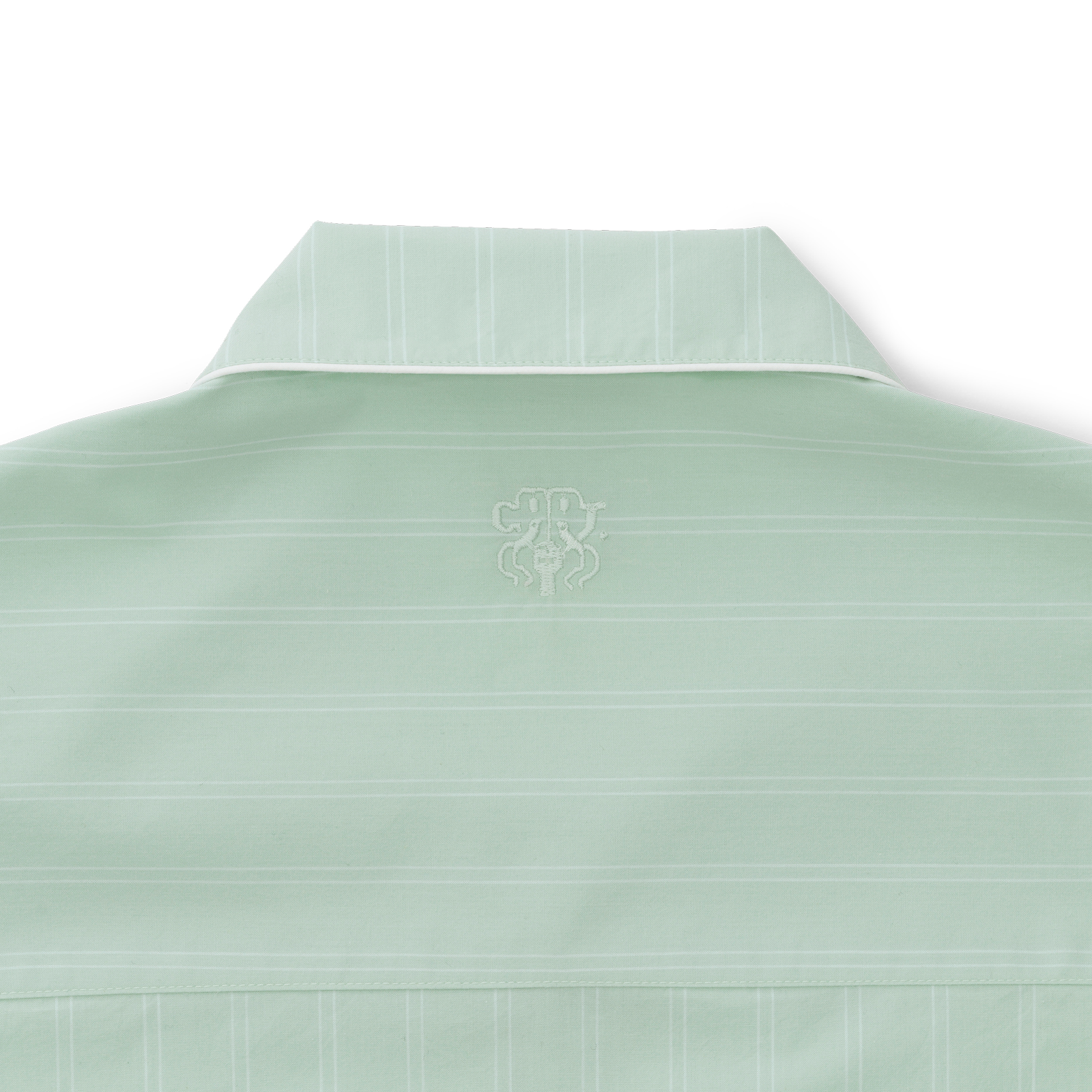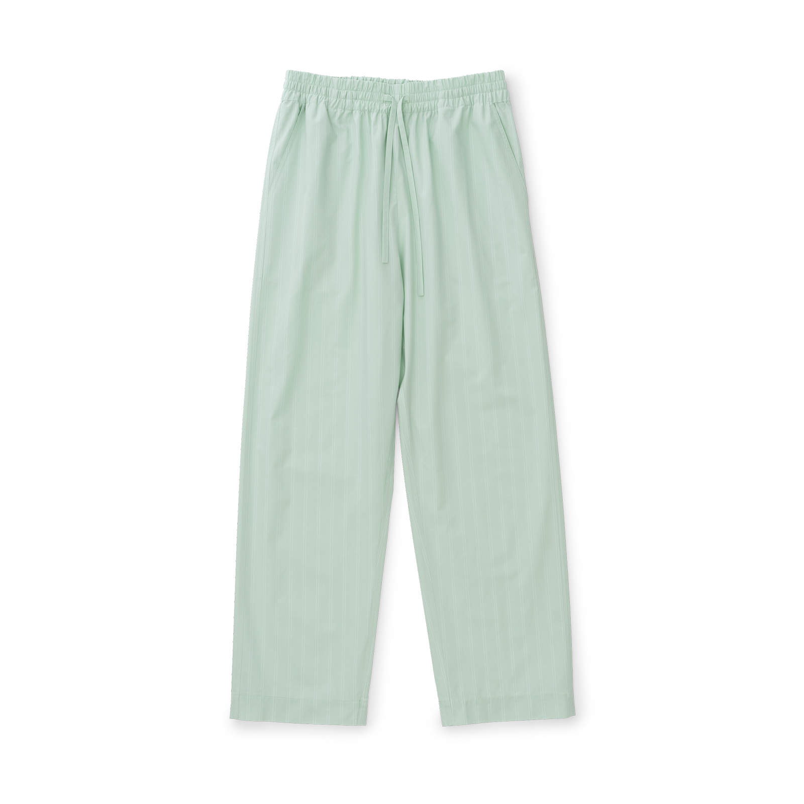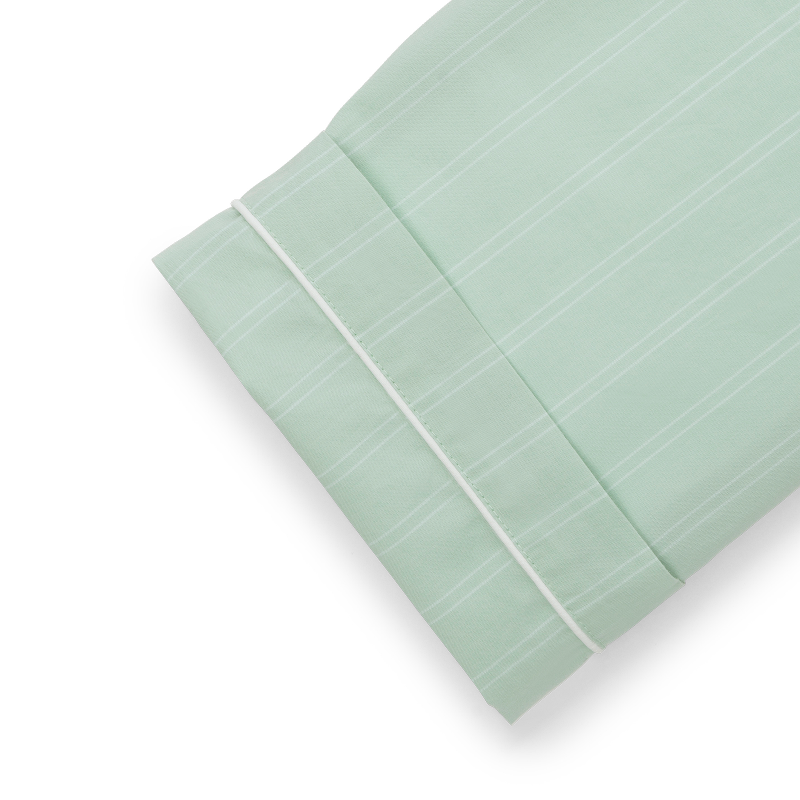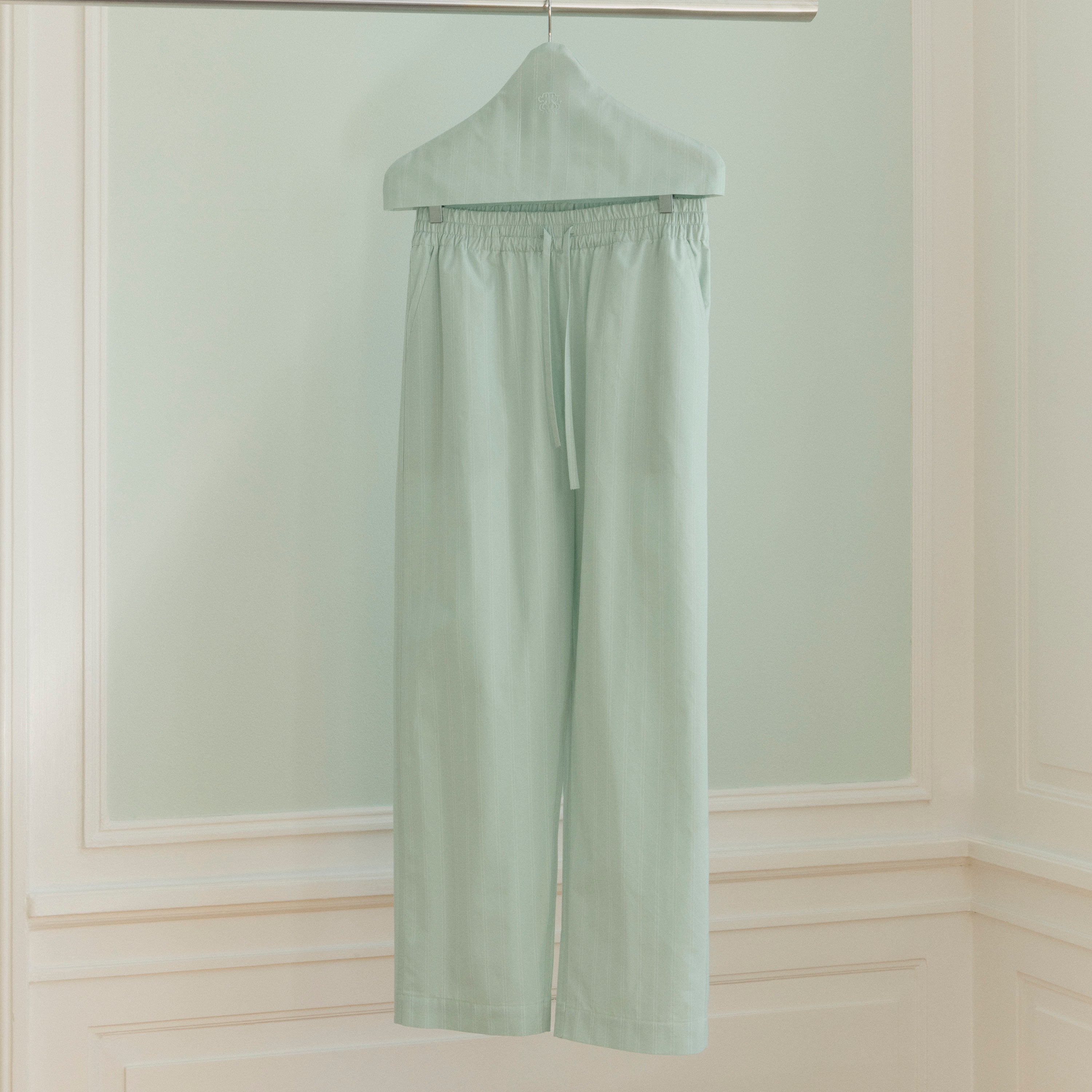 Unisex-Pyjamas aus Supima-Baumwollperkal gewebt. Der Pyjama hat einen klassischen Schnitt, elegante weiße Paspeln und schlanke Nadelstreifen vor einem Hintergrund in der Farbe Glass Green – ein klarer, grün-blauer Farbton, inspiriert von der Farbe von Rohglas.