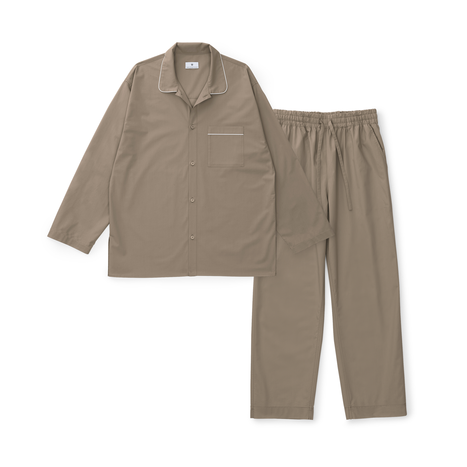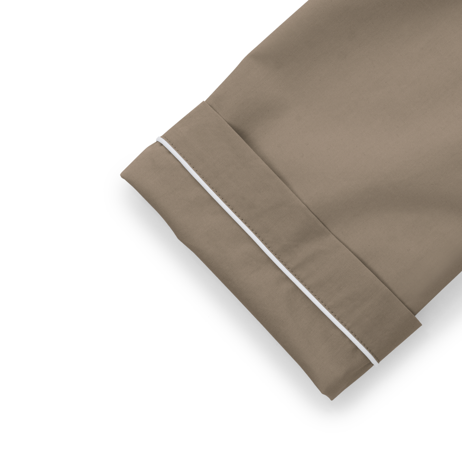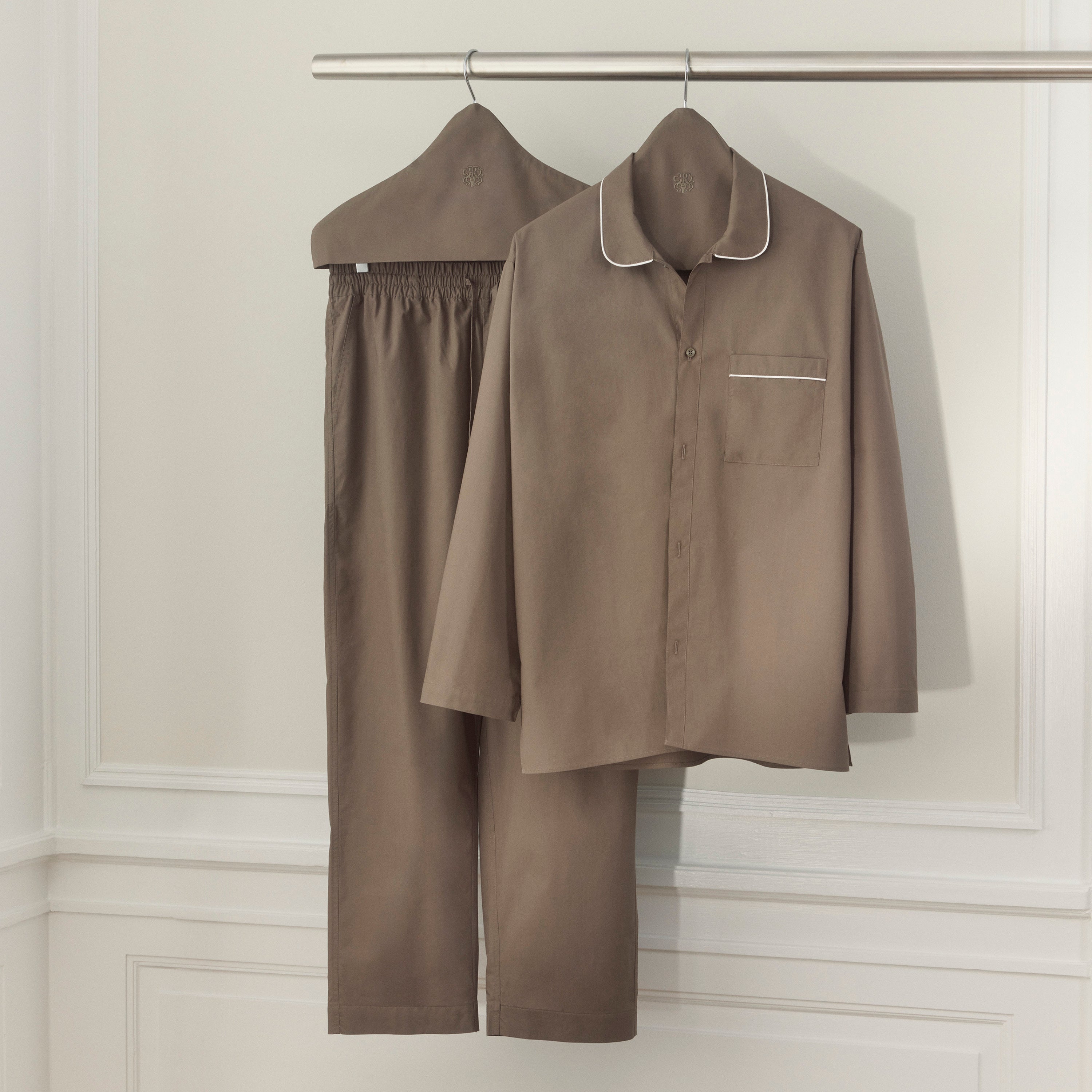 Unisex-Pyjama aus perkalgewebter Supima-Baumwolle. Der Pyjama hat einen klassischen Schnitt und elegante weiße Paspeln. Walnut ist ein tiefes, nussbraunes Farbton.