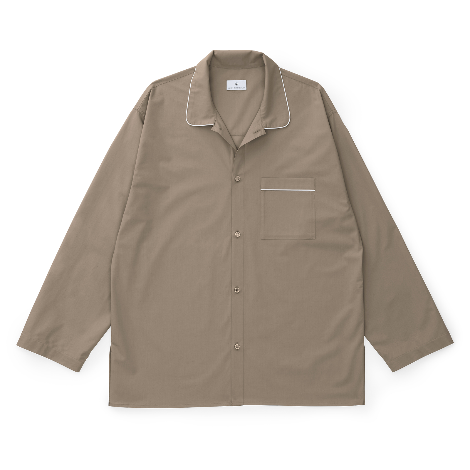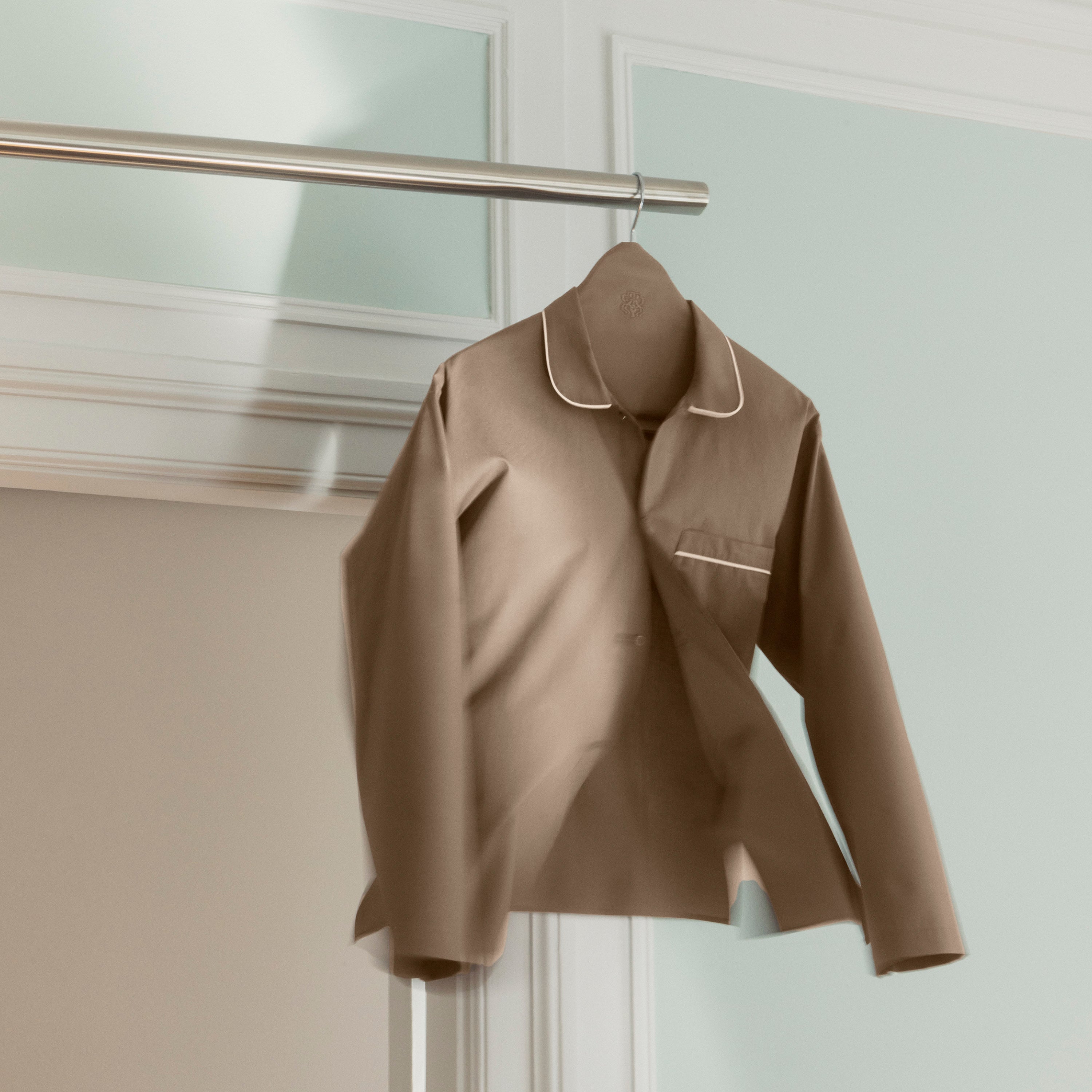 Das Hemd verfügt über Seitenschlitze, eine Brusttasche, einen abgerundeten Kragen und das ikonische Georg Jensen Damask-Logo, das auf dem Rücken am Hals auf dem Passe gestickt ist. Die Hose hat einen breiten und bequemen elastischen Bund, Taschen und einen Kordelzug. Die Hosen- und Ärmellänge kann leicht mit einem Umschlag angepasst werden, dessen Innenseite eine elegante Paspel aufweist.