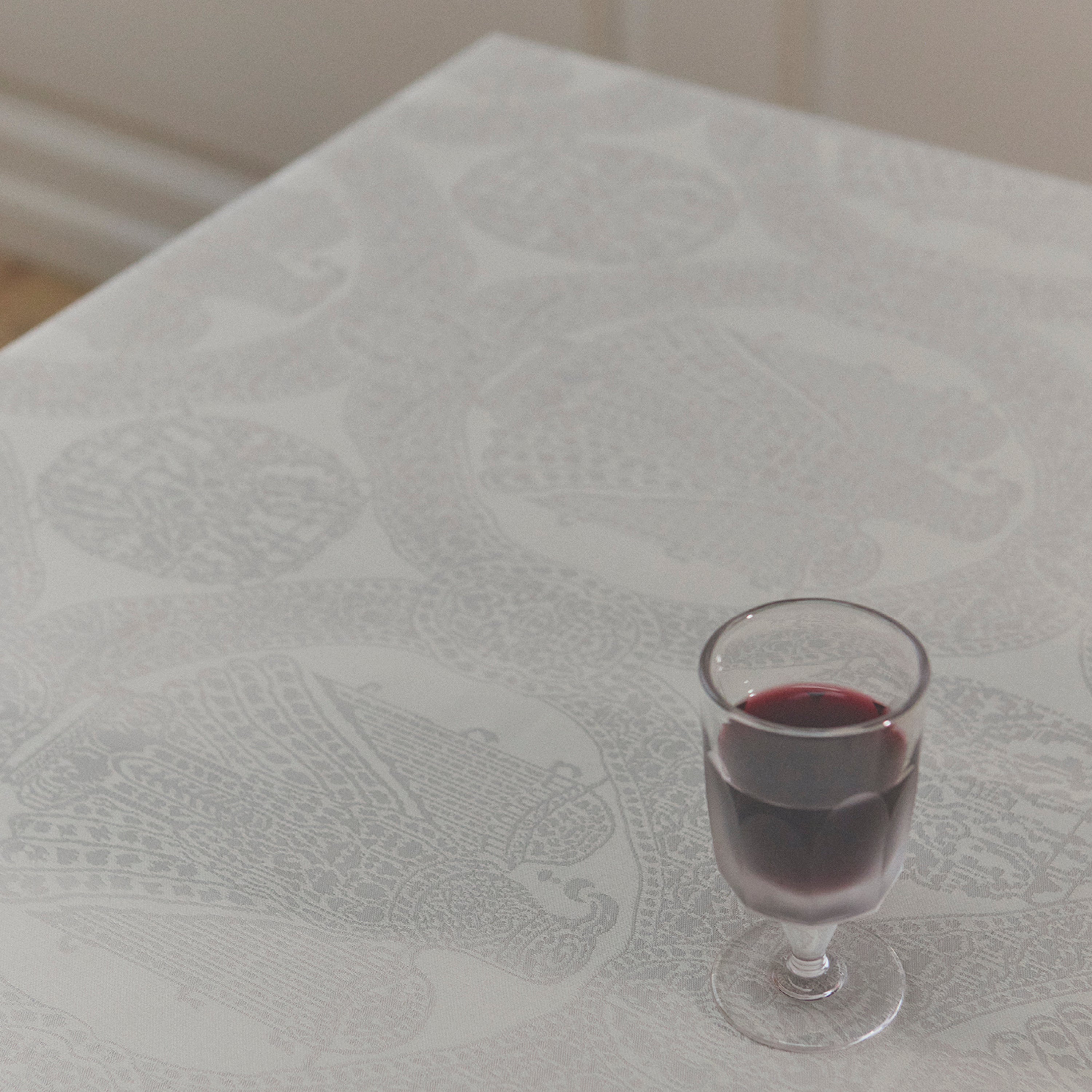 Diese Tischdecke ist aus 100 % doppelt gezwirnter, gekämmter Baumwolle gewebt und sie ist in der schönen hellgrauen Farbe Light Grey erhältlich. Die spezielle Damastbindung verleiht dieser Sct. Knuds-Ørne-Tischdecke eine schöne, changierende Optik.