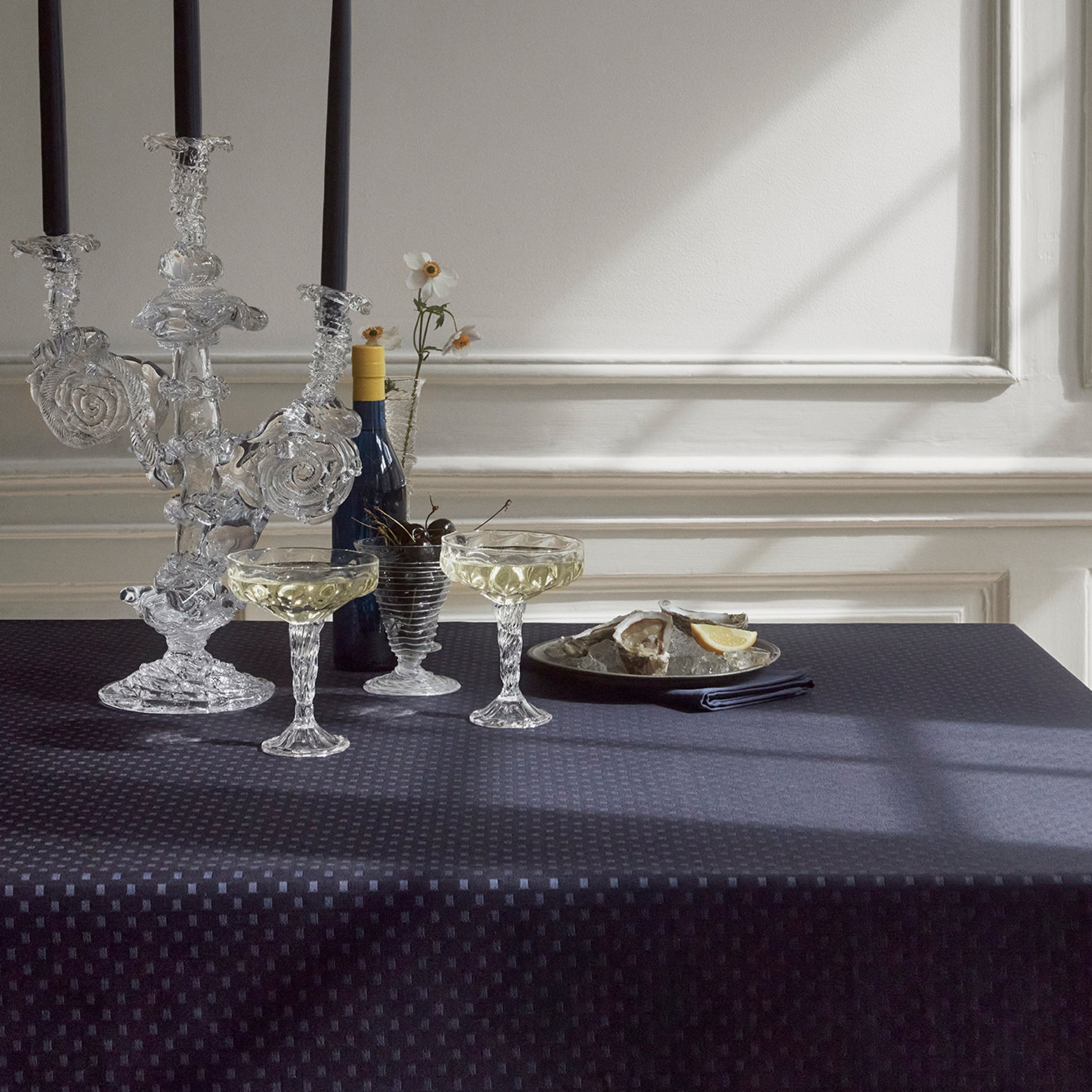 Die Tischdecke Schneeflocke wurde von der Textilkünstlerin Jette Nevers entworfen, die auch für weitere der geometrischen Textilmuster von Georg Jensen Damask verantwortlich ist. Inspiriert von der Reinheit und stillen Anwesenheit der Schneeflocken hat sie ein Design erschaffen, dessen Schlichtheit und klarer Look Ruhe auf dem Tisch verleiht.