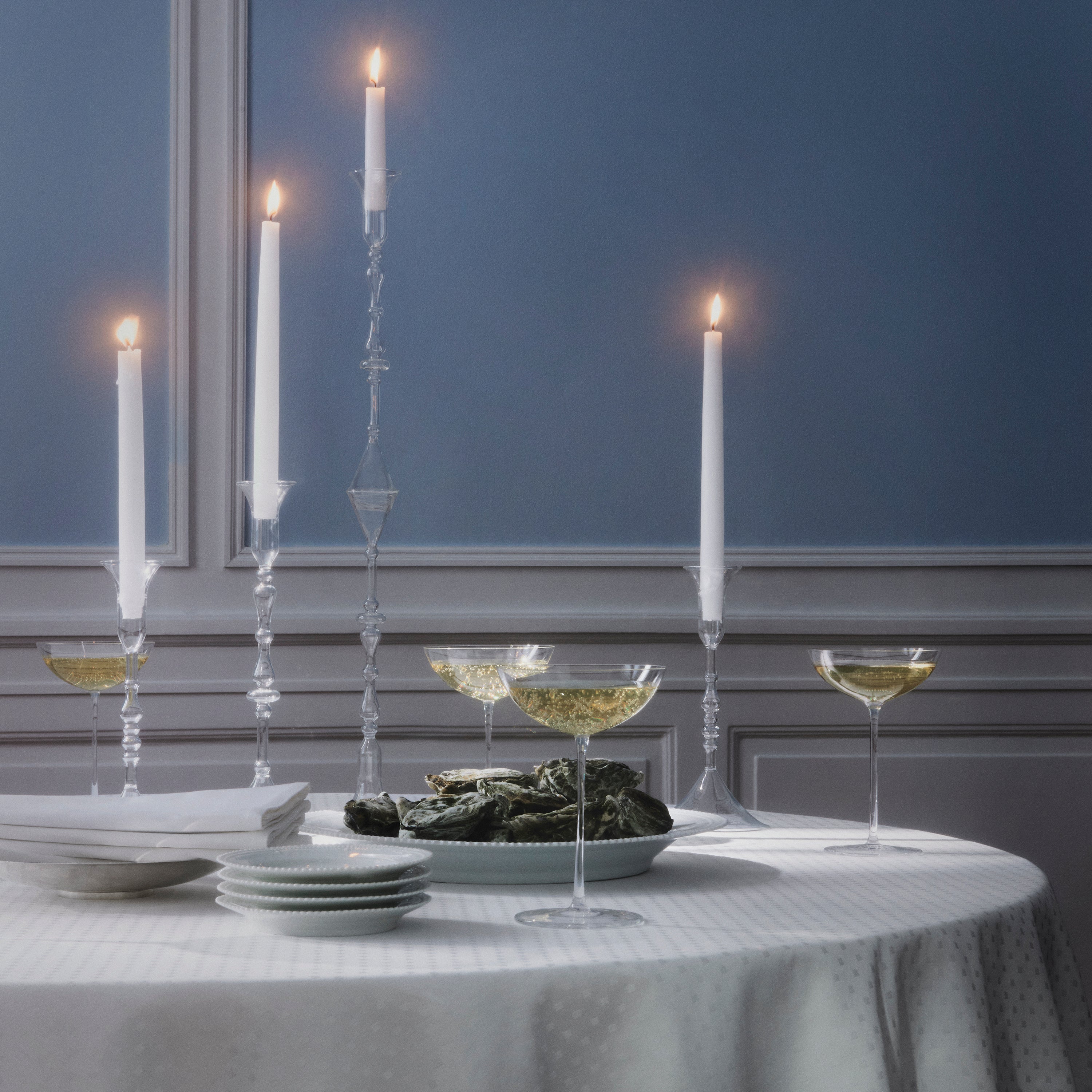 Schneeflocke ist das einzige unserer runden Tischtücher, das in zwei Größen erhältlich ist. Wir empfehlen eine Fallhöhe von etwa 20 bis 25 cm, um dafür zu sorgen, dass die Tischdecke schön fällt. Vervollständigen Sie den gedeckten Tisch mit gewebten Servietten aus Baumwolle oder Leinen.