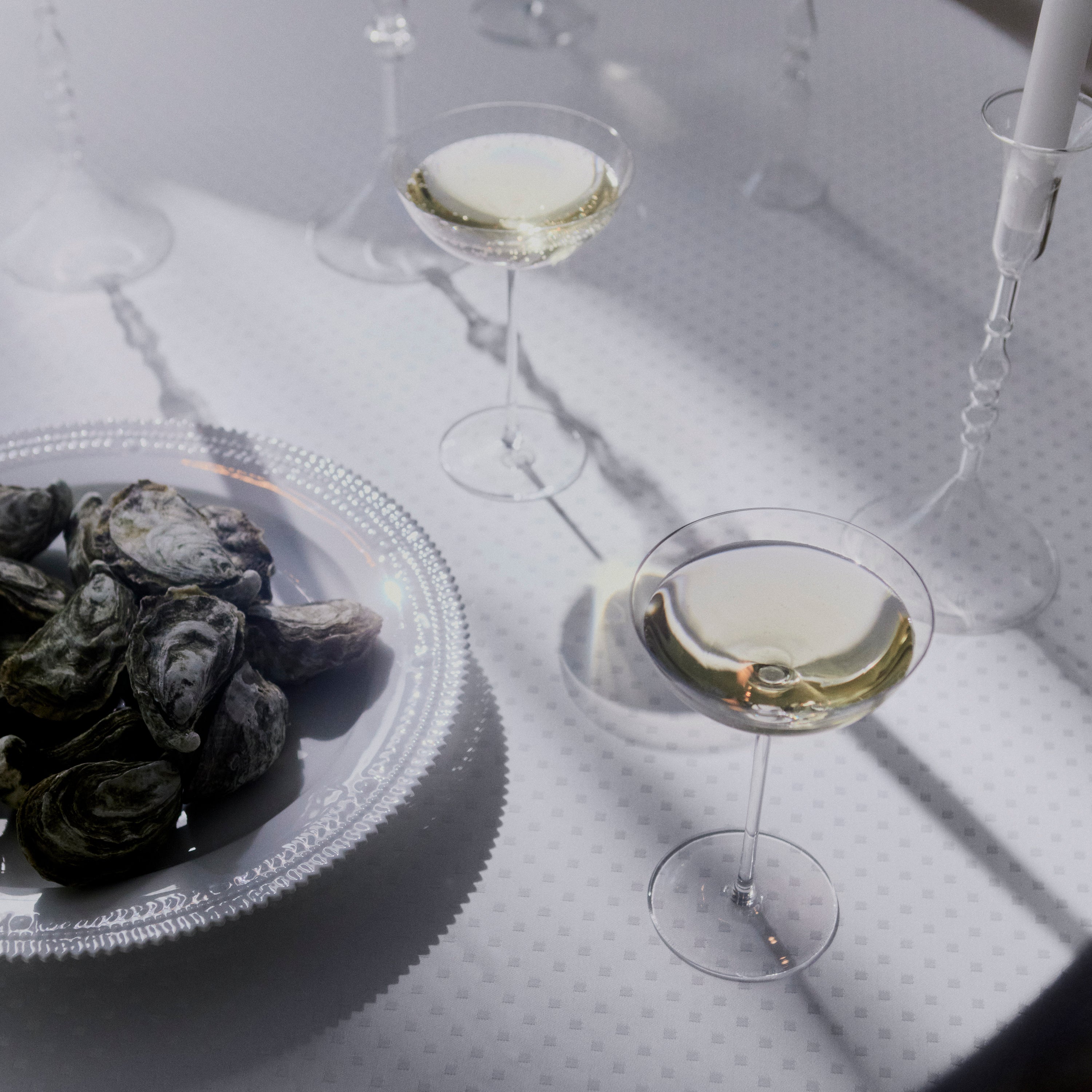 Das Design von Schneeflocke stammt von der Textilkünstlerin Jette Nevers, die eine Reihe von Textilmustern für Georg Jensen Damask entworfen hat. Inspiriert von der Reinheit der Schneeflocken und deren stillen Präsenz in der Welt, hat sie ein Design geschaffen, das dem Tisch durch seine Schlichtheit und Strenge eine ruhige Optik verleiht.