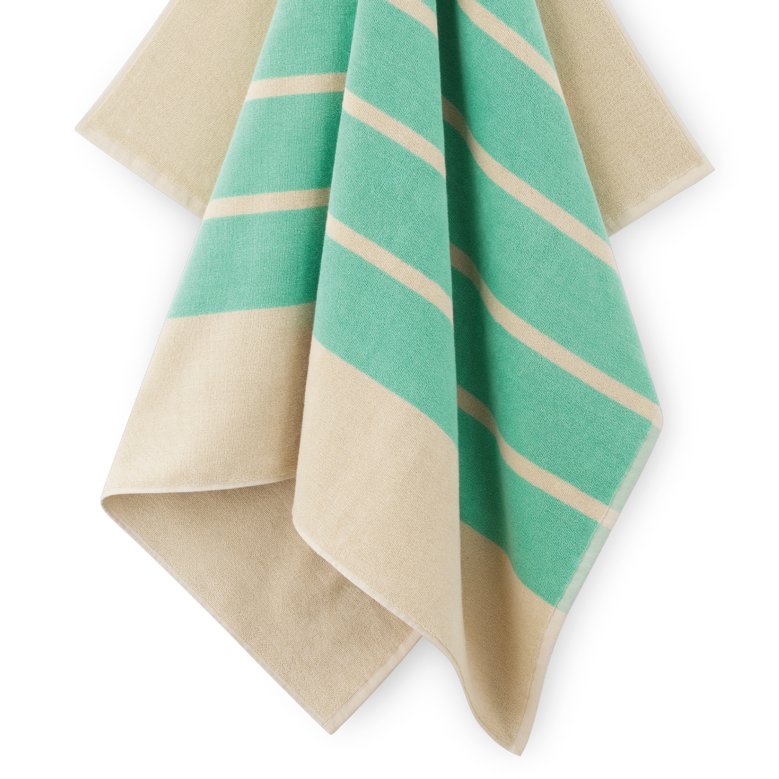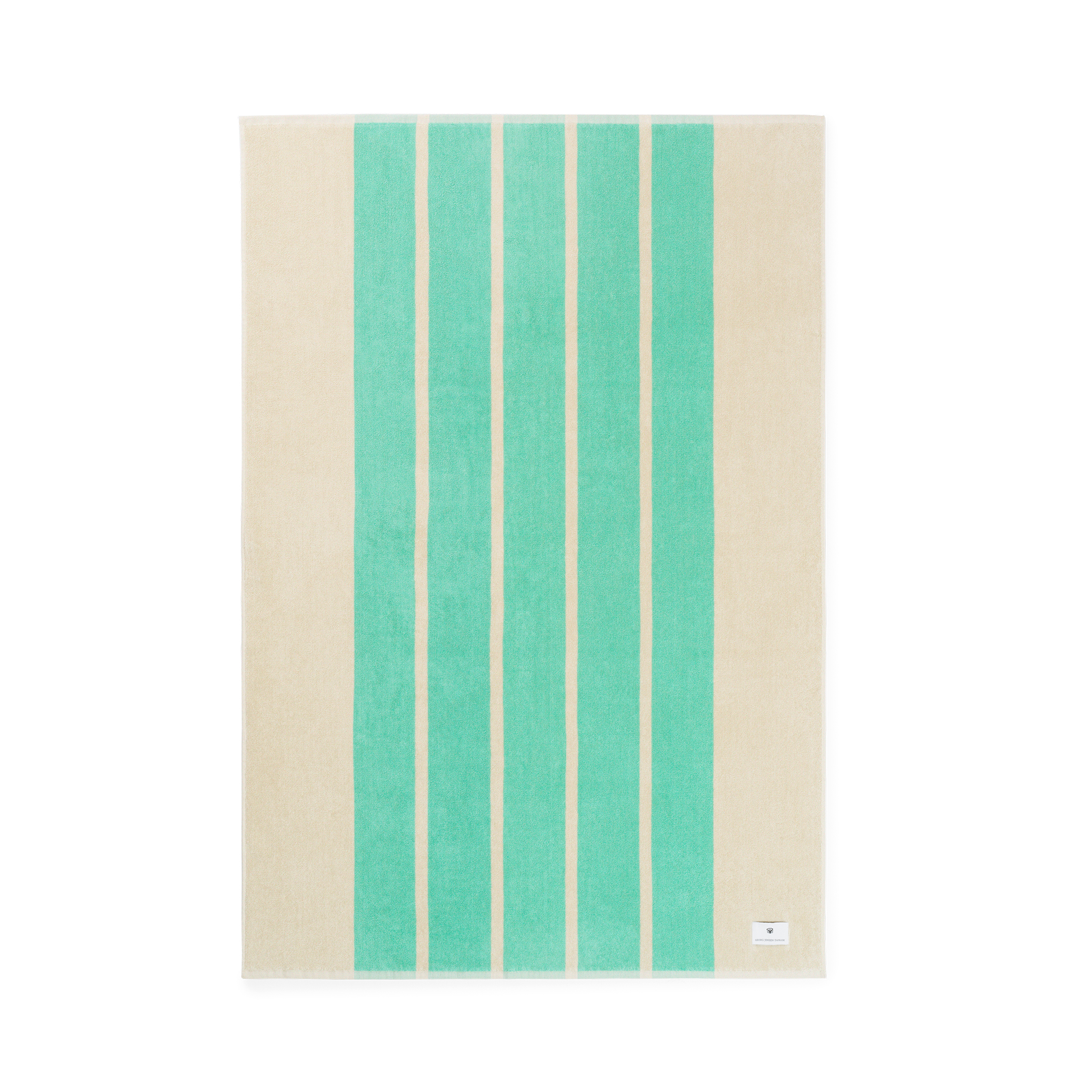 Set mit Sun Stripe Badelaken und Canvastasche in der Farbe Mint Green mit türkisblauen Streifen auf sandfarbenem Grund.