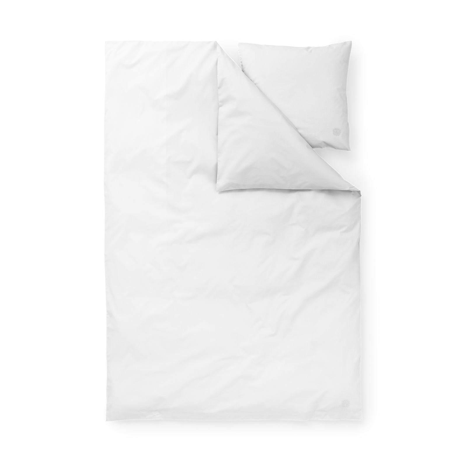 Der Bettbezug wird mithilfe von Bändern geschlossen und der Kissenbezug ist mit einem einen Hotelverschluss ausgestattet. Als dezentes Detail trägt das Bettwäscheset das ikonische Logo von Georg Jensen Damask. Bei der Farbe White handelt es sich um ein reines Weiß.