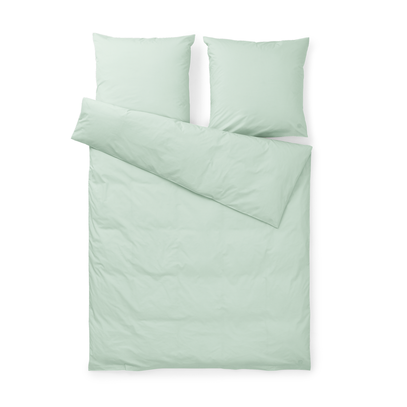 Der Bettbezug wird mithilfe von Bändern geschlossen und die Kissenbezüge sind mit einem einen Hotelverschluss ausgestattet. Als dezentes Detail trägt das Bettwäscheset das ikonische Logo von Georg Jensen Damask. Die klare, grünblaue Farbe Glass Green ist von der Farbe von Rohglas inspiriert.