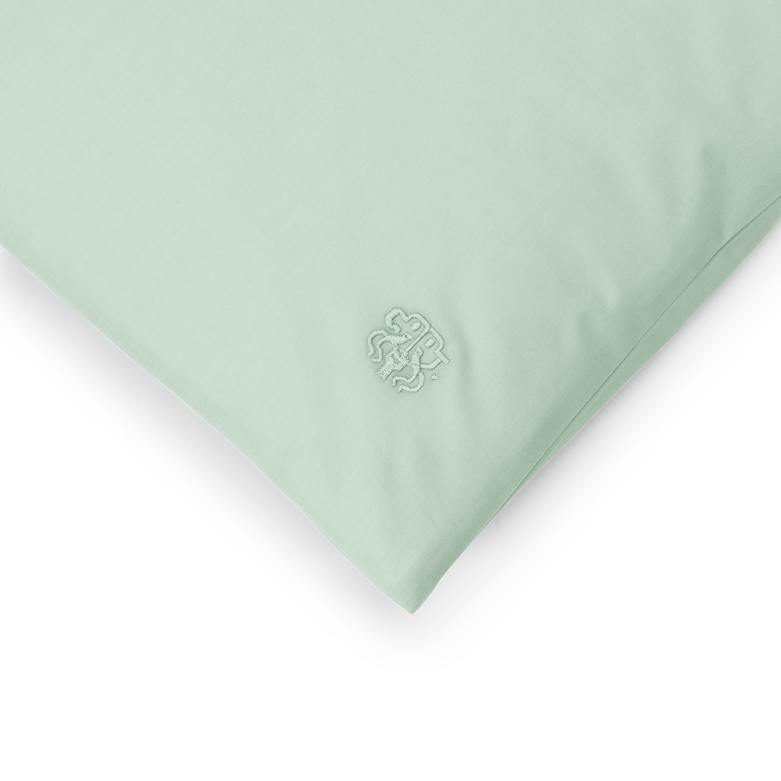 Der Kopfkissenbezug besitzt einen Hotelverschluss und trägt als dezente Stickerei das ikonische Logo von Georg Jensen Damask. Die klare, grünblaue Farbe Glass Green ist von der Farbe von Rohglas inspiriert.