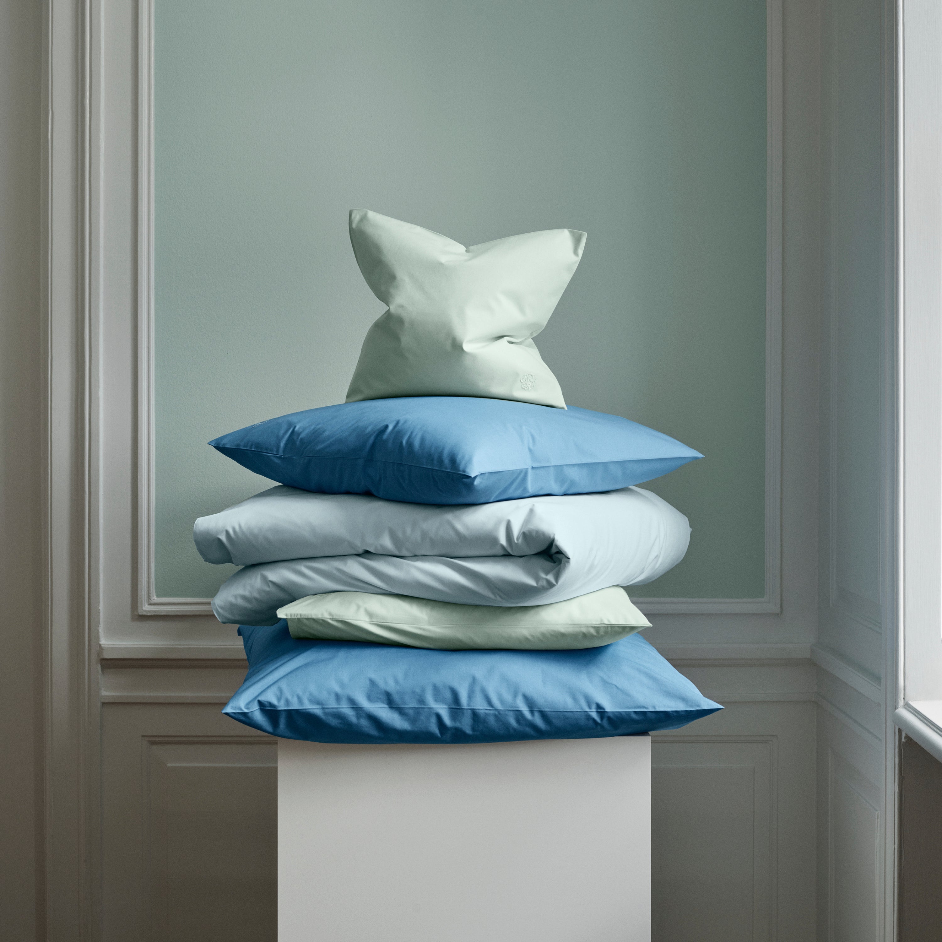 Der Bettbezug wird mithilfe von Bändern geschlossen und die Kissenbezüge sind mit einem einen Hotelverschluss ausgestattet. Als dezentes Detail trägt das Bettwäscheset das ikonische Logo von Georg Jensen Damask. Bei Minimal Blue handelt es sich um eine sehr leichte Hellblau-Variante mit einem Hauch von Aquatönen.