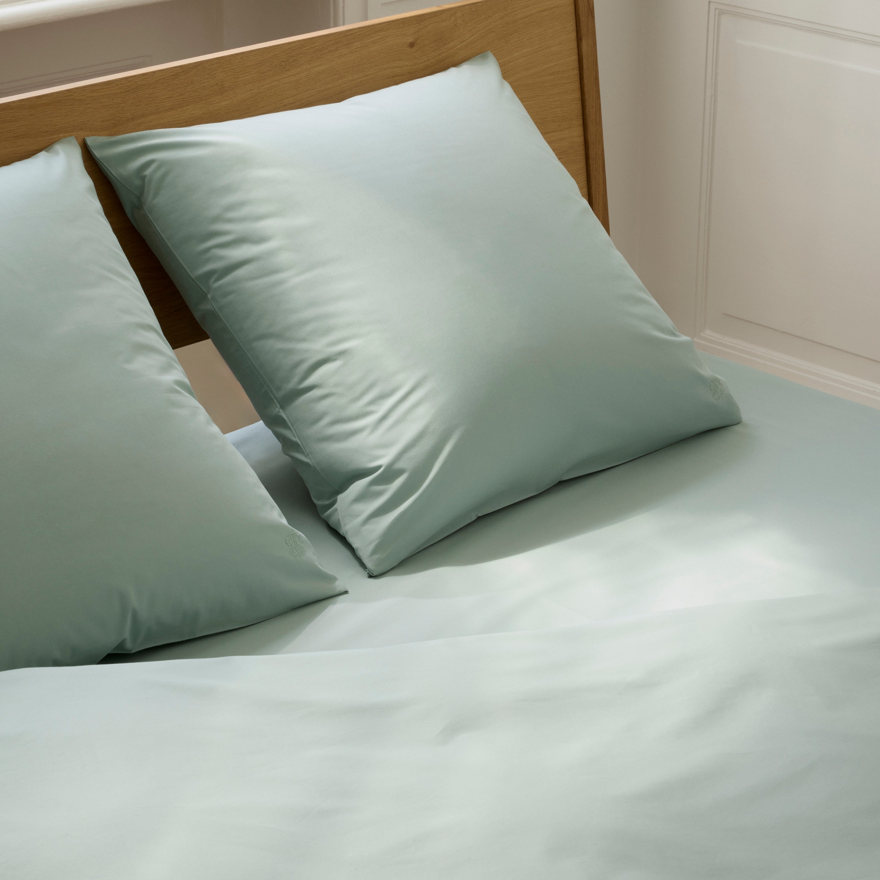 Der Bettbezug wird mithilfe von Bändern geschlossen und die Kissenbezüge sind mit einem einen Hotelverschluss ausgestattet. Als dezentes Detail trägt das Bettwäscheset das ikonische Logo von Georg Jensen Damask. Sage Green ist ein Grünton mit dezenten blau-grauen Untertönen.