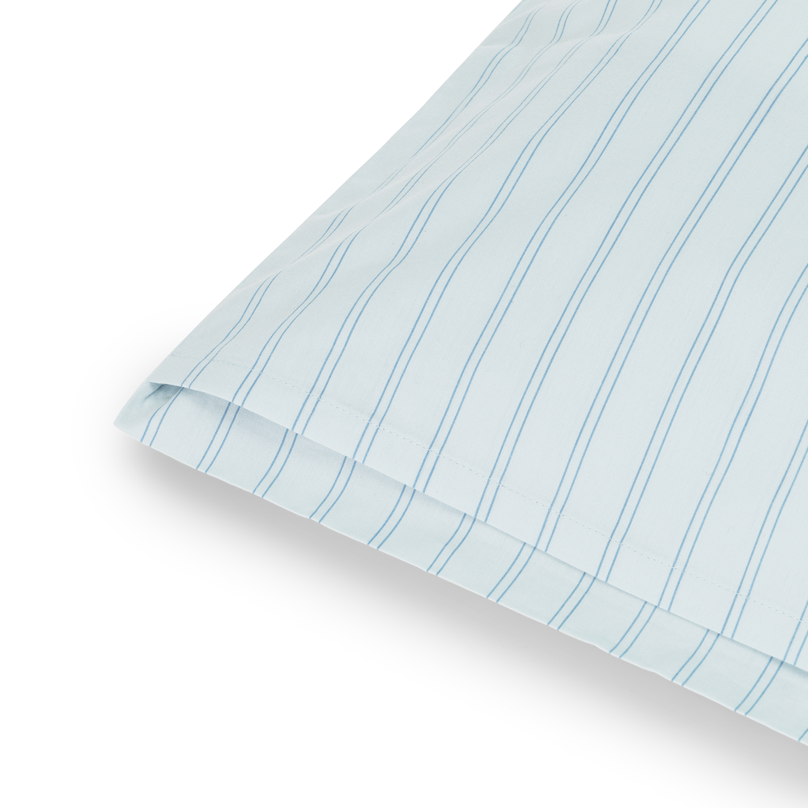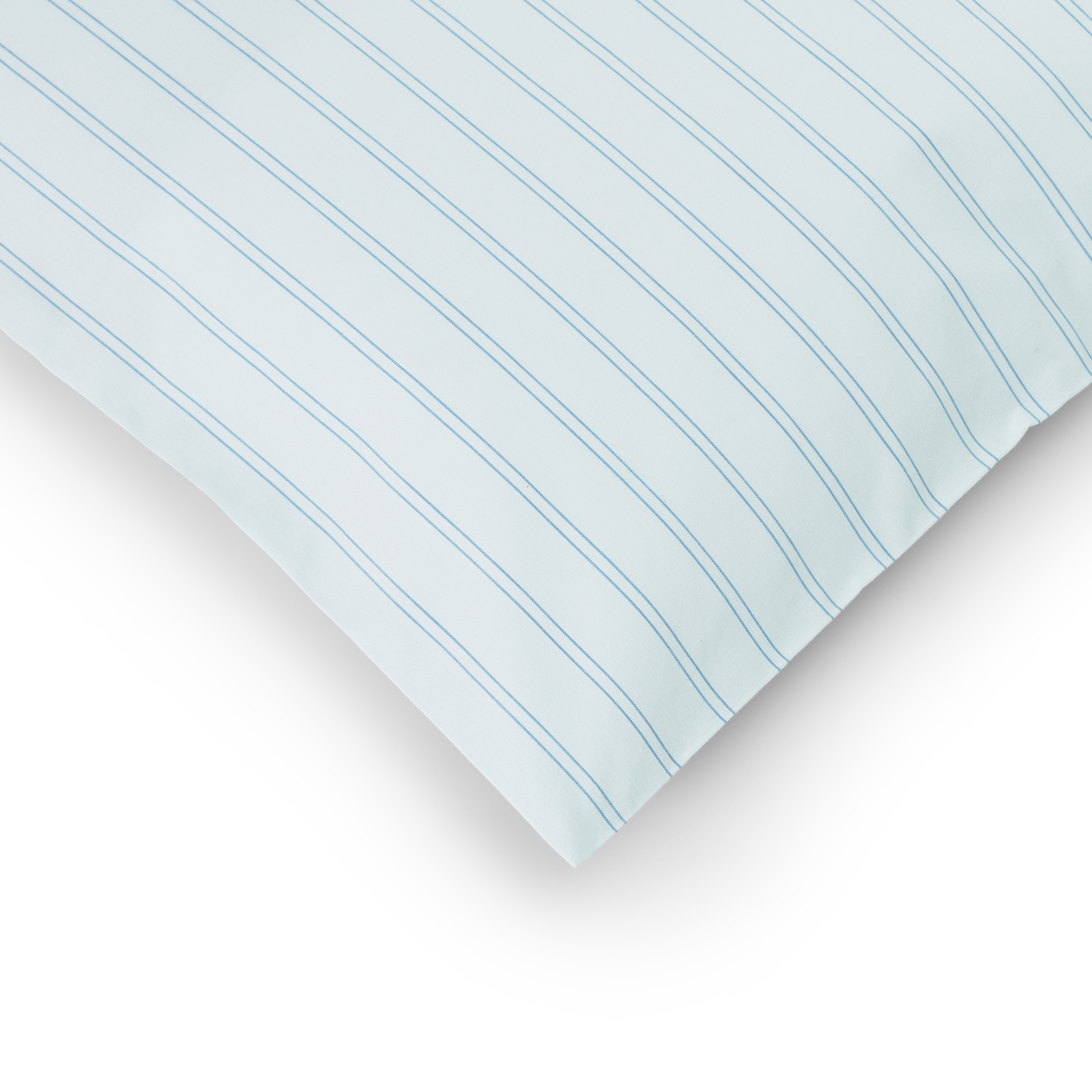 Der Supima Percale Pinstripe Kissenbezug hat feine Nadelstreifen in Bright Blue auf einem Hintergrund in der Farbe Minimal Blue – einem sehr hellen Blauton mit einem Hauch von Aqua.