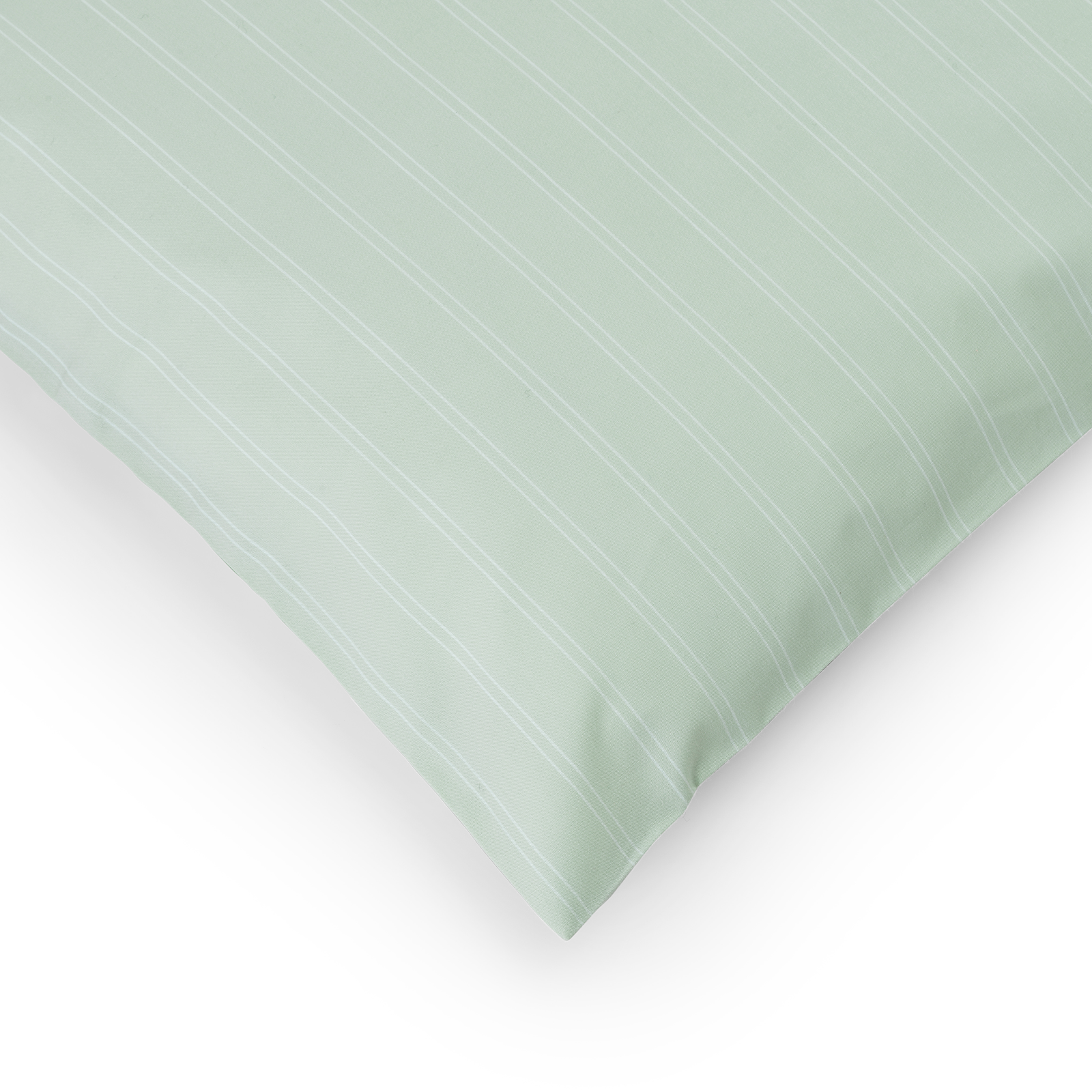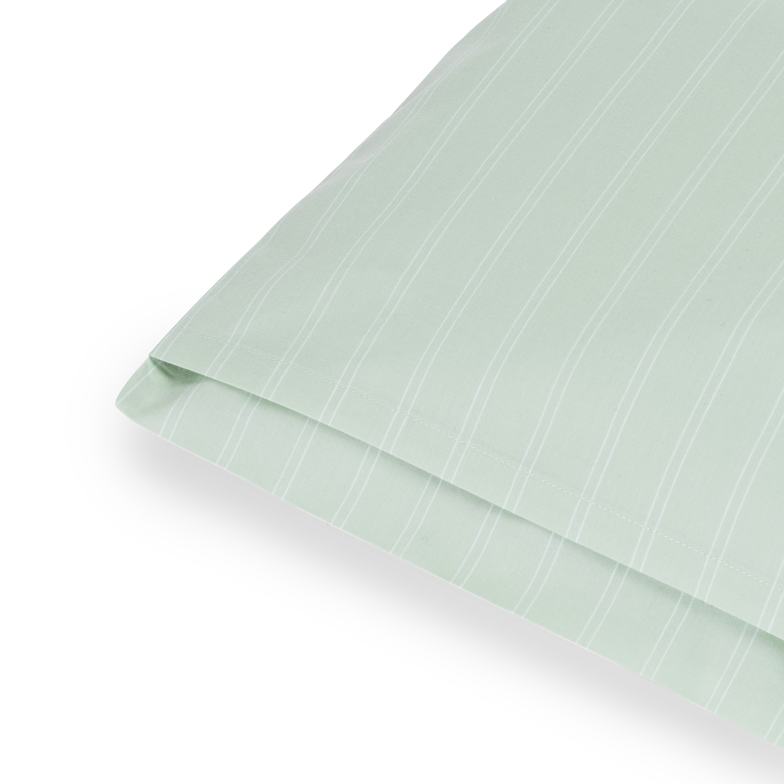 Der Supima Pinstripe Kissenbezug hat feine, weiße Nadelstreifen auf einem Hintergrund in der Farbe Glass Green – ein klarer grünblauer Ton, inspiriert von der Farbe von Rohglas.