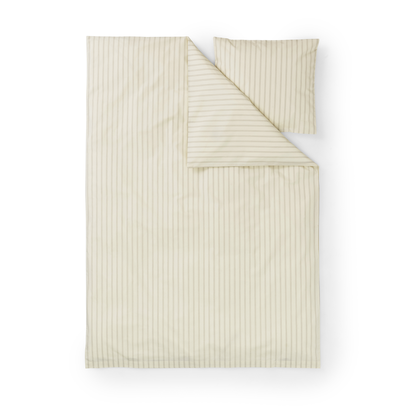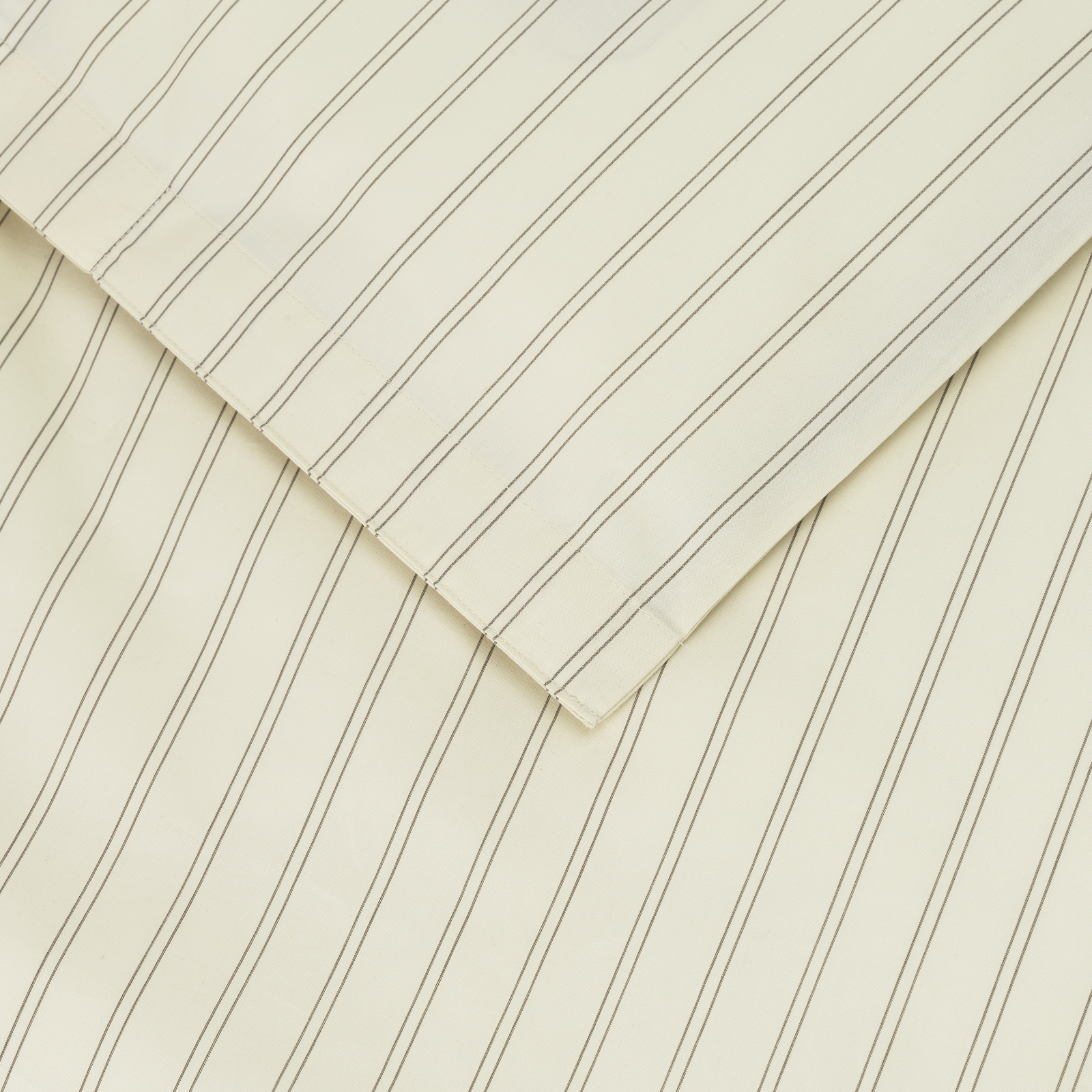 Supima Percale Pinstripe Bettwäsche-Set für Kinder zeigt feine Nadelstreifen in der Farbe Walnut auf einem Hintergrund in Archive Linen – einem hellen, nussigen Farbton.