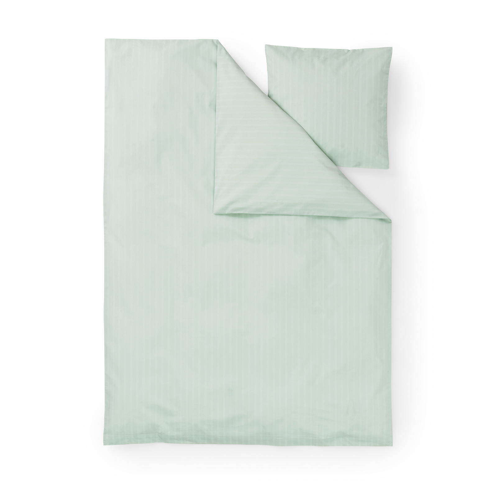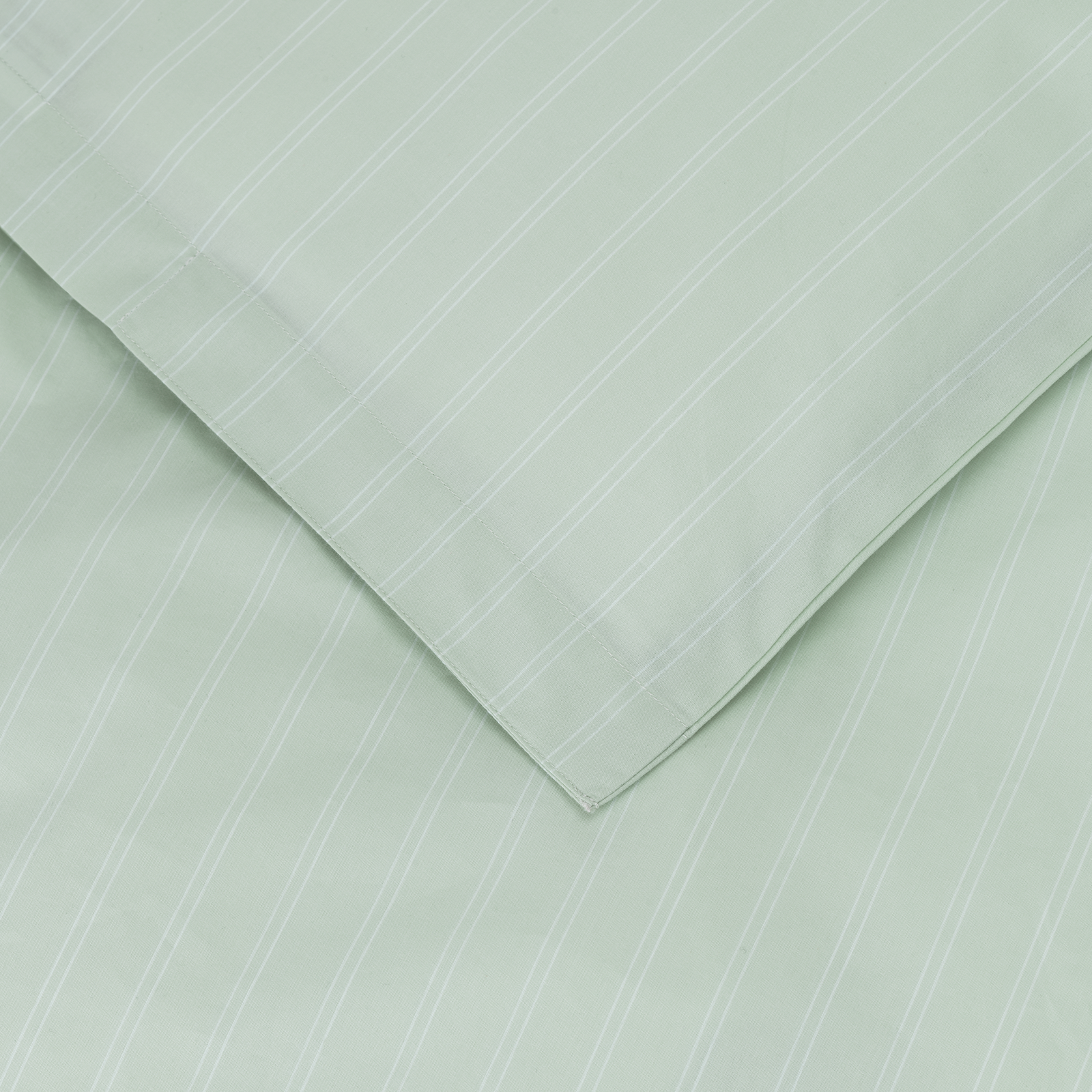Das Supima Percale Pinstripe Bettwäsche-Set für Kinder hat feine, weiße Nadelstreifen auf einem Hintergrund in Glass Green – einem klaren, blaugrünen Farbton, der von der Farbe von Rohglas inspiriert ist.