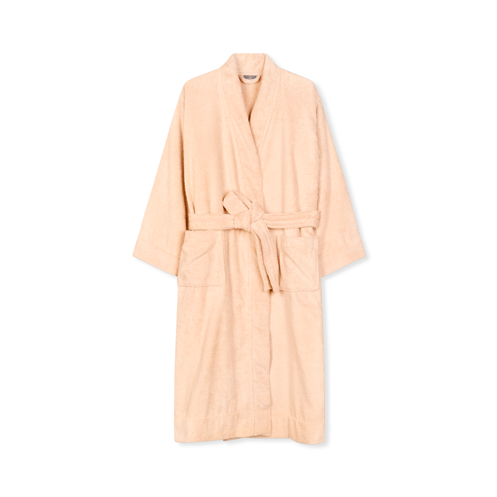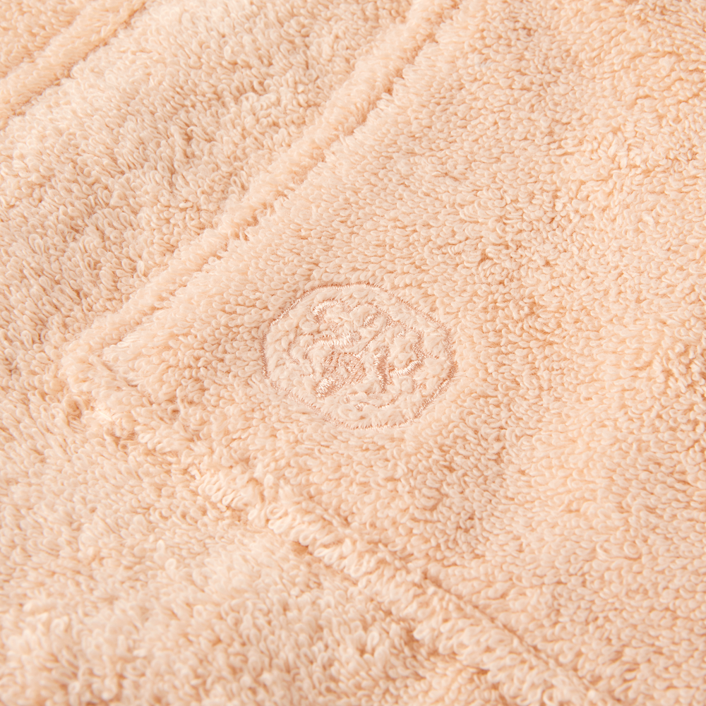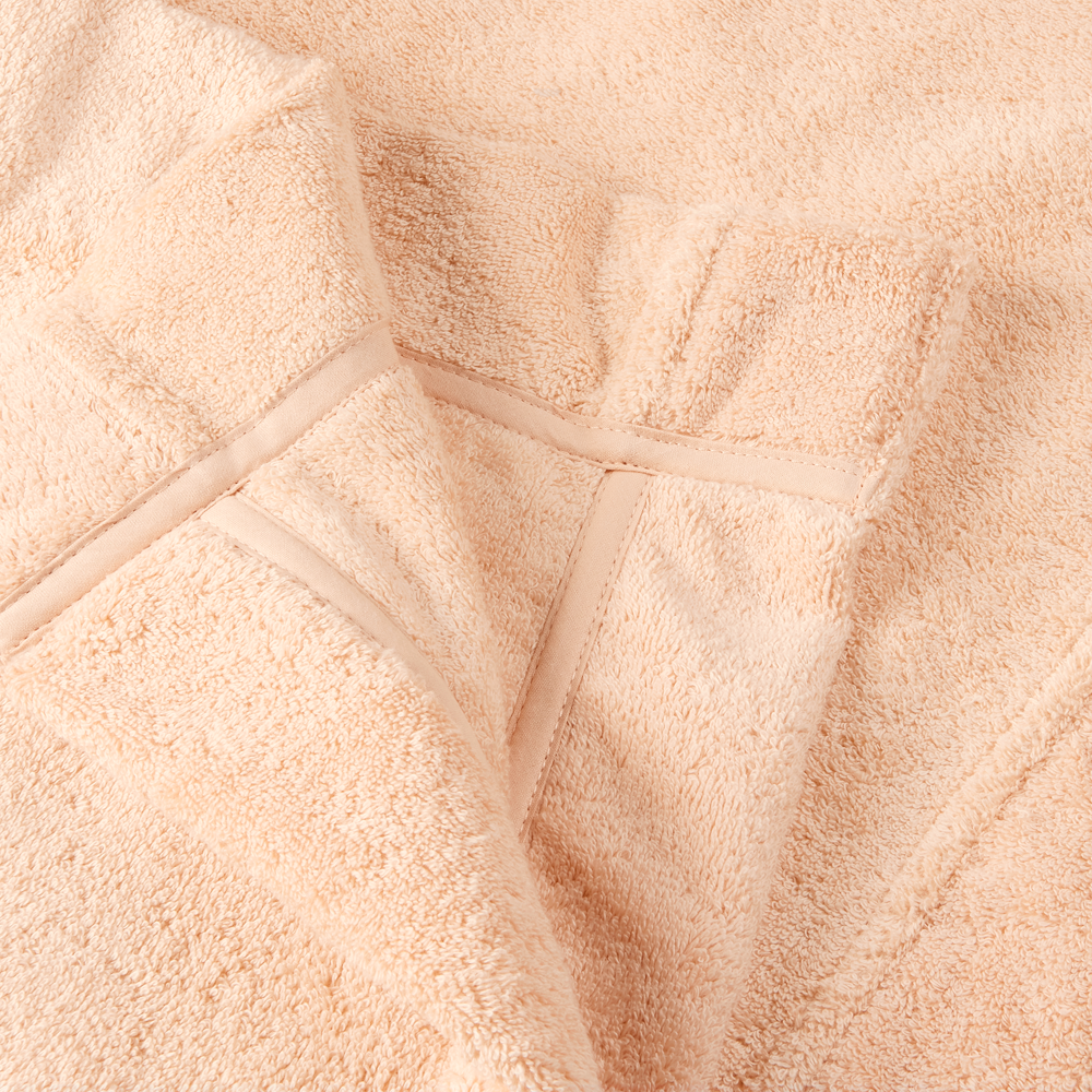Dieser Bademantel ist auf der Vorderseite mit zwei großen Taschen und mit aufgesticktem Logo ausgestattet, und hat eine Länge, die bis unter das Knie geht. Die Innennähte sind mit Baumwollbändern eingefasst – ein exklusives Detail, das für zusätzlichen Komfort sorgt.