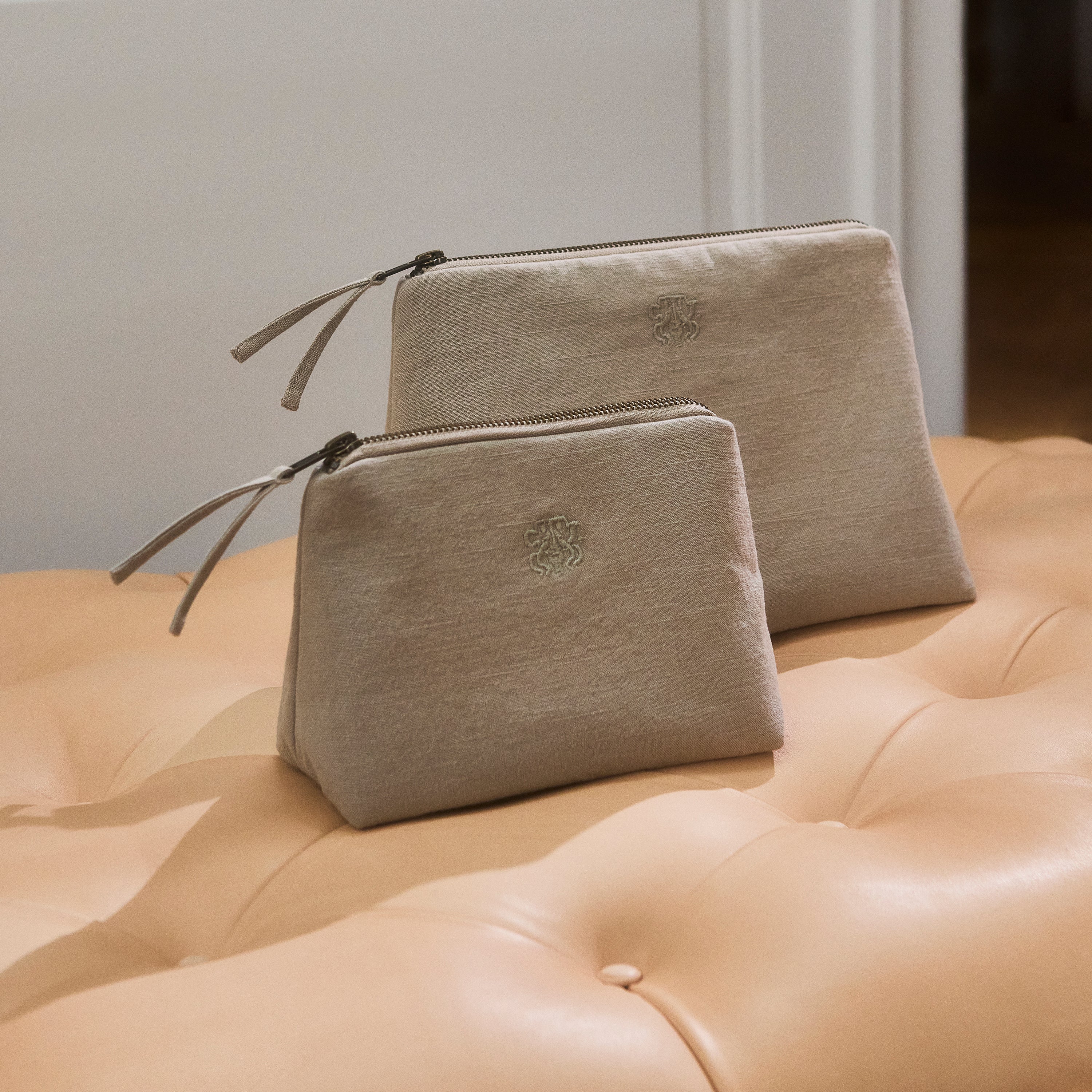 Funktionale und geräumige Kulturbeutel in zeitlosem Design. Die All-Kulturbeutel ist aus 100 % Baumwolle gewebt, hat eine Innentasche und trägt das eingestickte Georg Jensen Damask-Logo als elegantes Detail. Die Farbe Cashmere ist ein dezenter, bräunlich-grauer Ton mit einem ruhigen und exklusiven Ausdruck – inspiriert von der Naturfarbe der Kaschmirwolle.